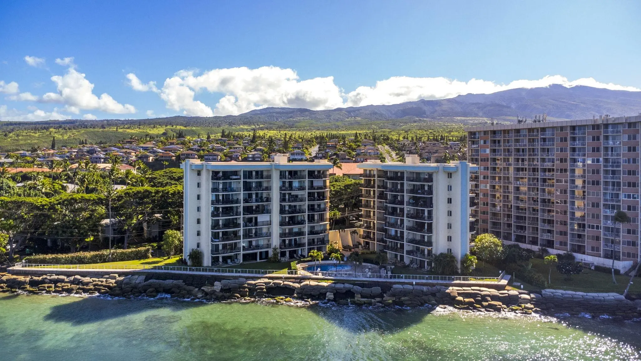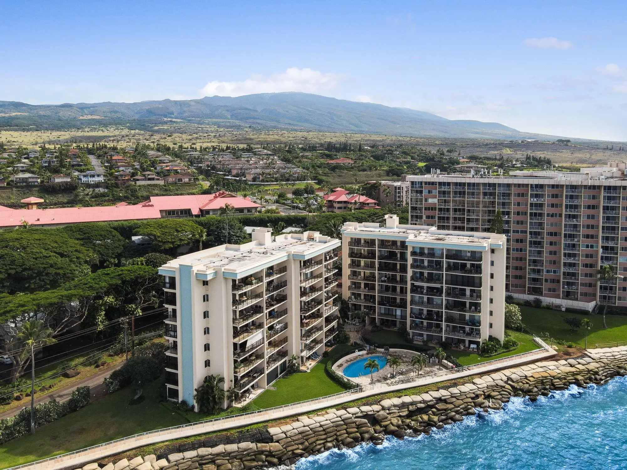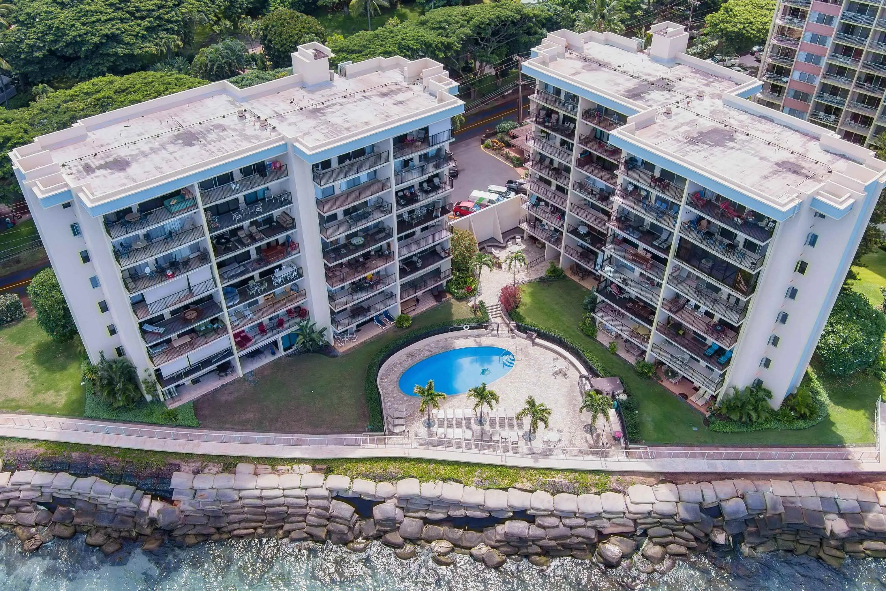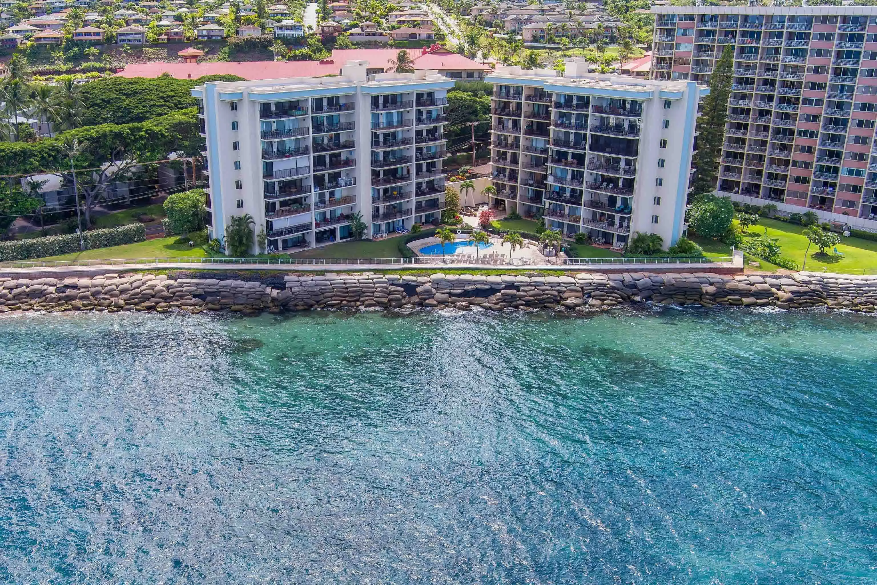 Lokelani Construction Company built this seaside development in 1974. The 65 condominiums cluster within two adjoining 8-story concrete buildings on a 1.43-acre coastal tract. The land rises just above an ocean-front seawall.