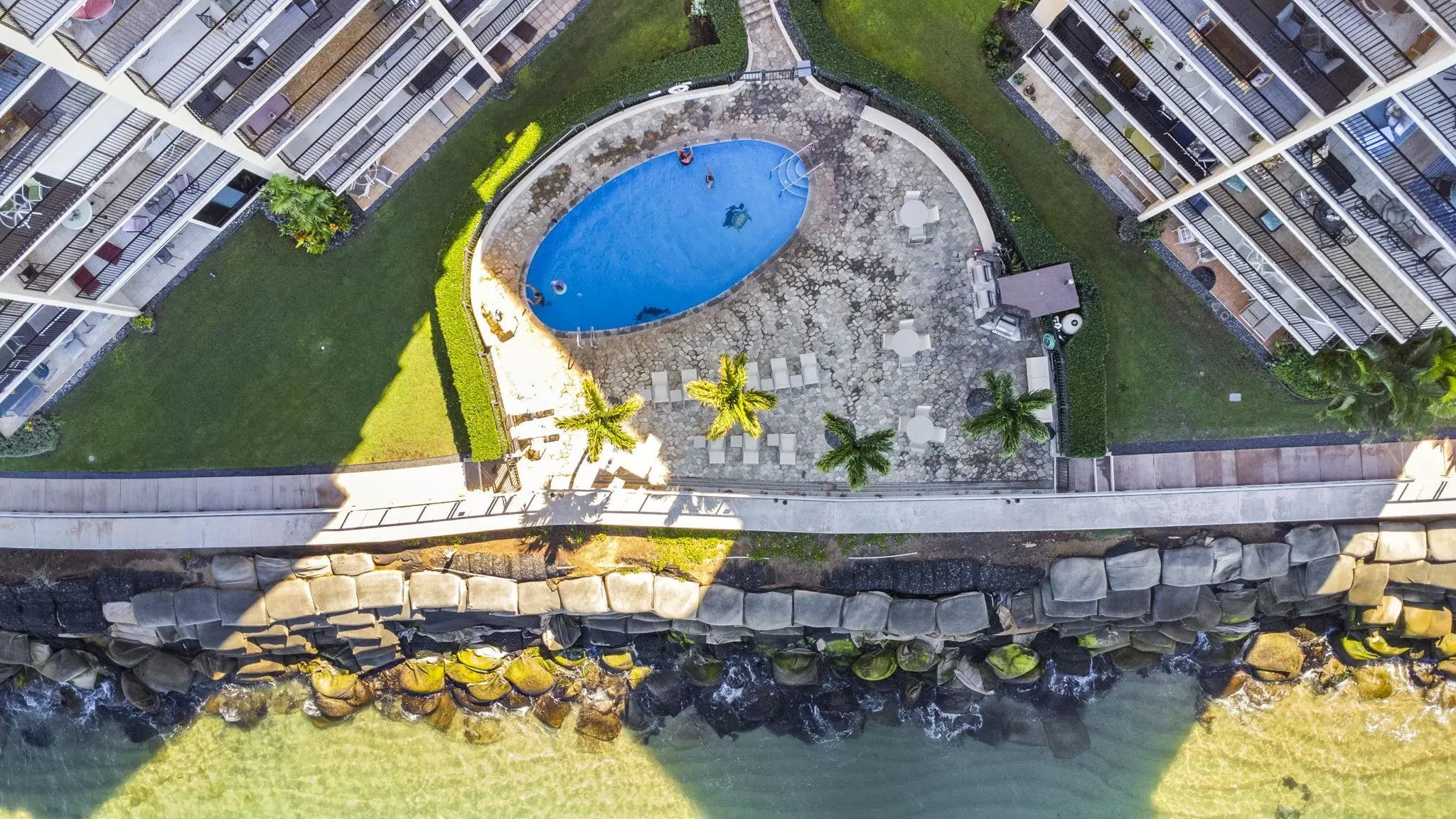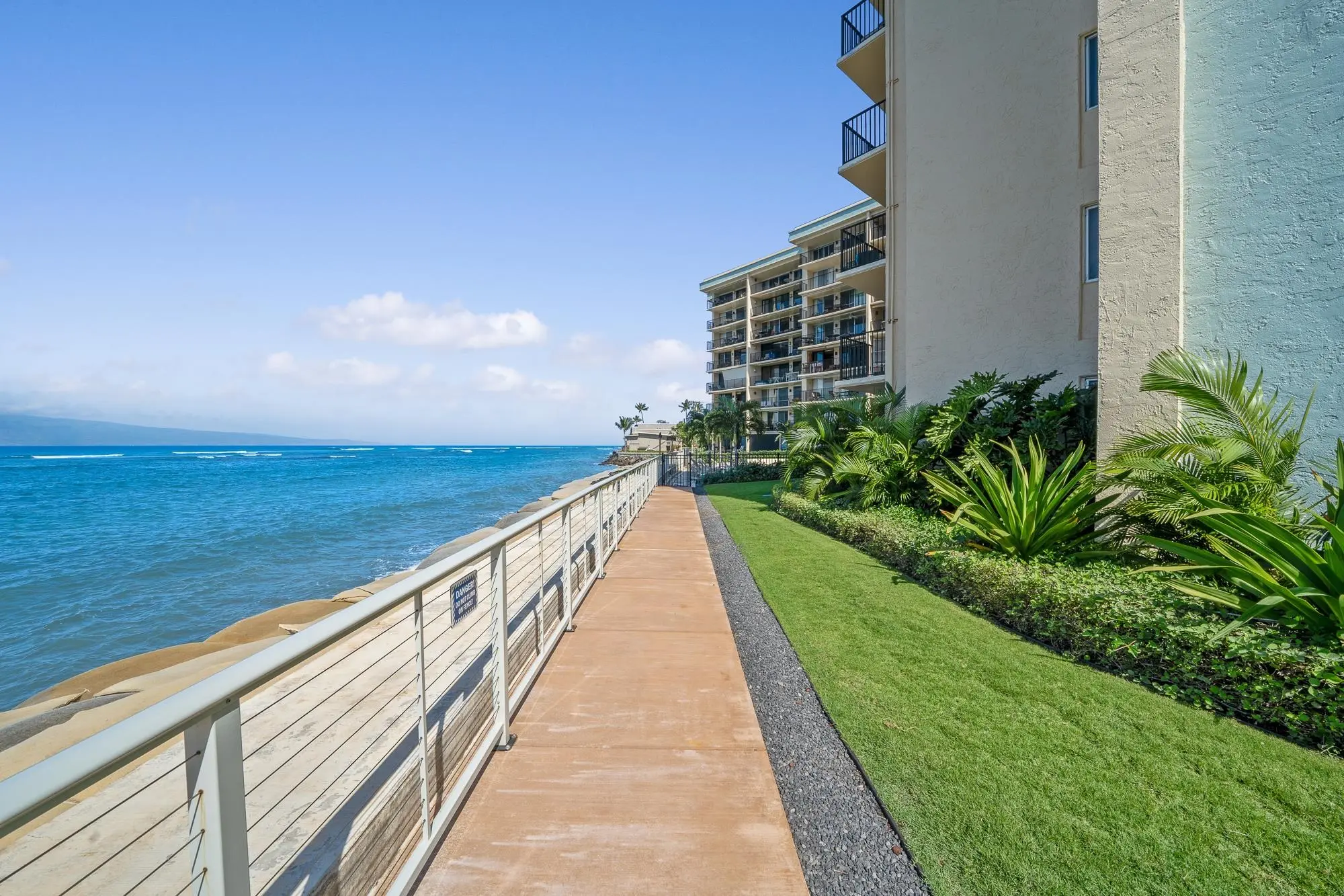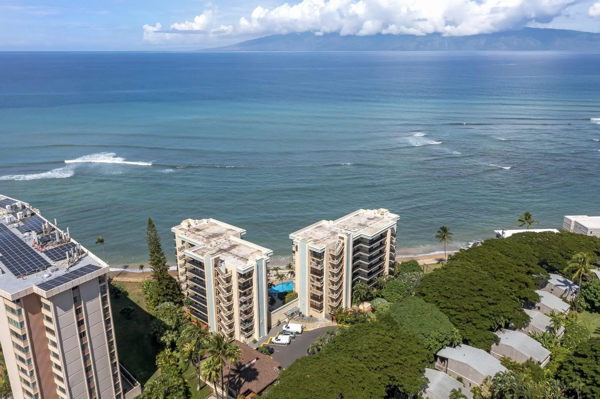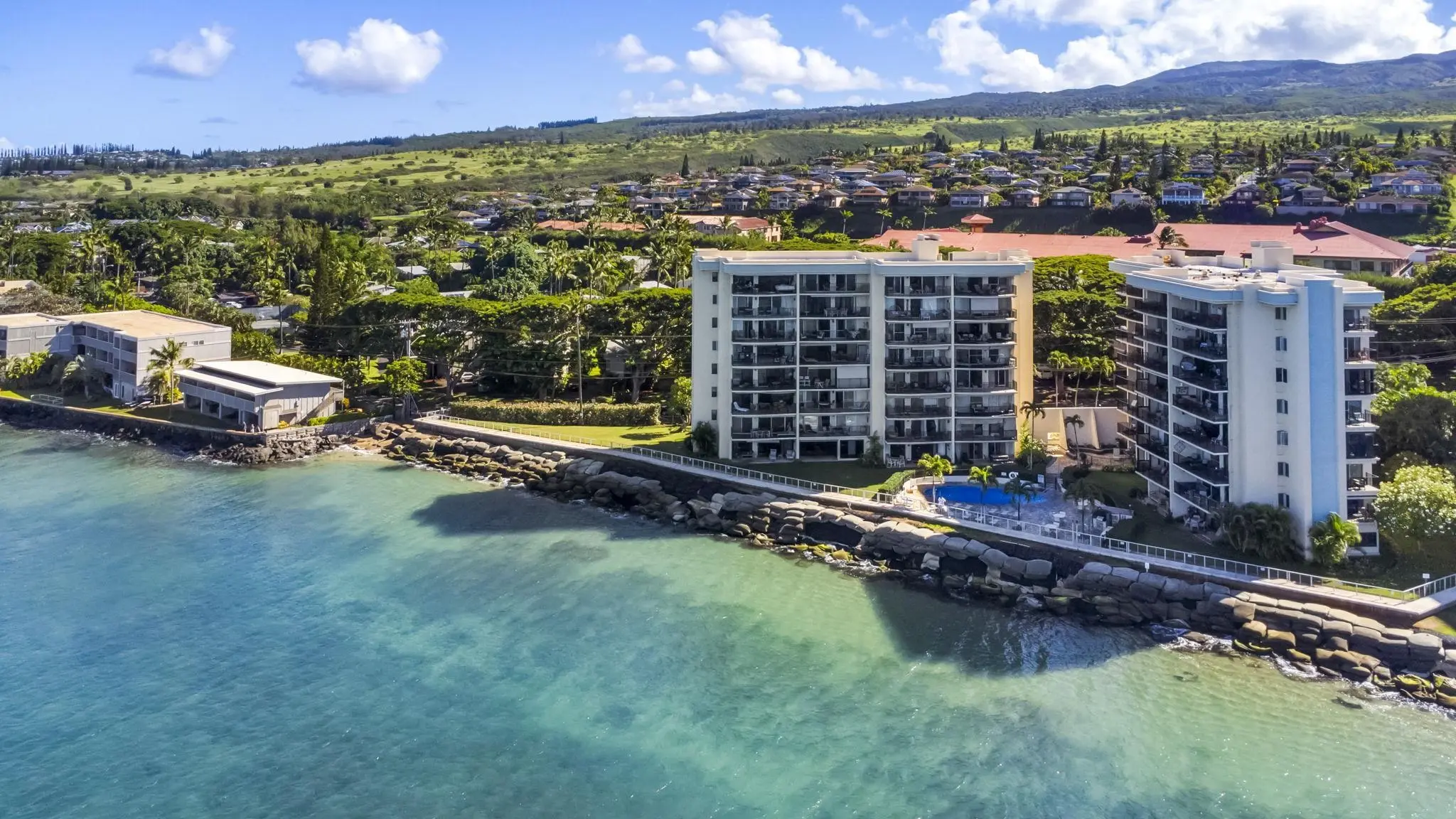 Lokelani Construction Company built this seaside development in 1974. The 65 condominiums cluster within two adjoining 8-story concrete buildings on a 1.43-acre coastal tract. The land rises just above an ocean-front seawall.