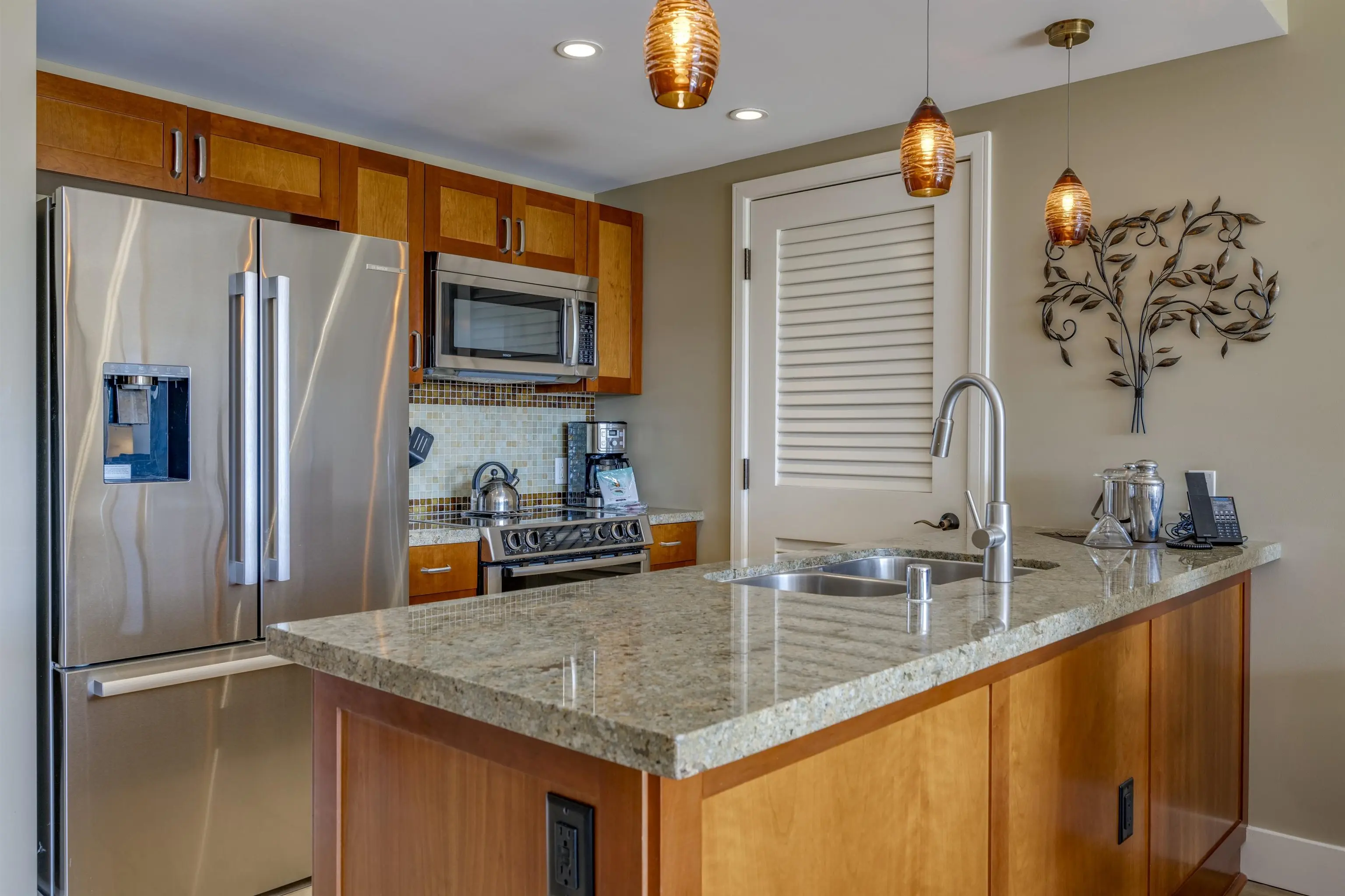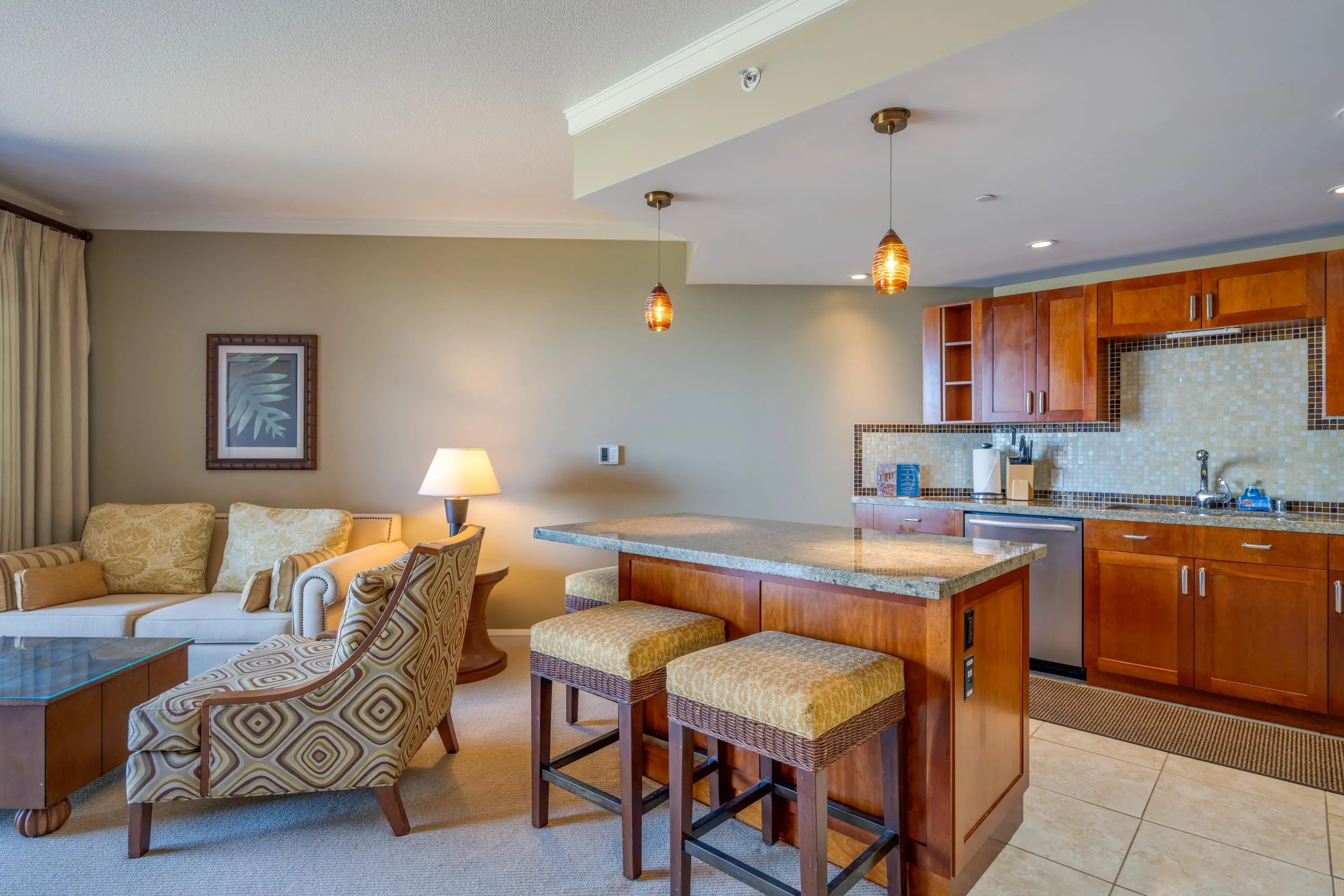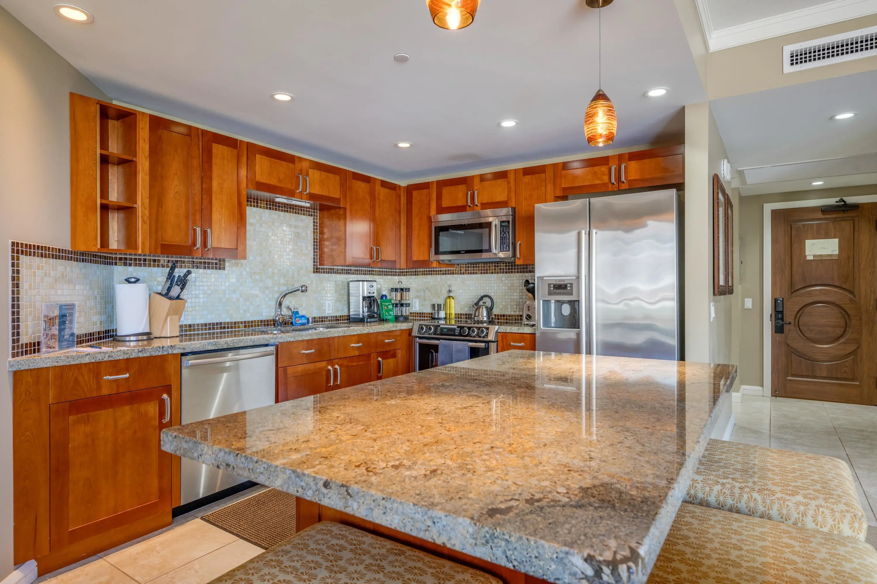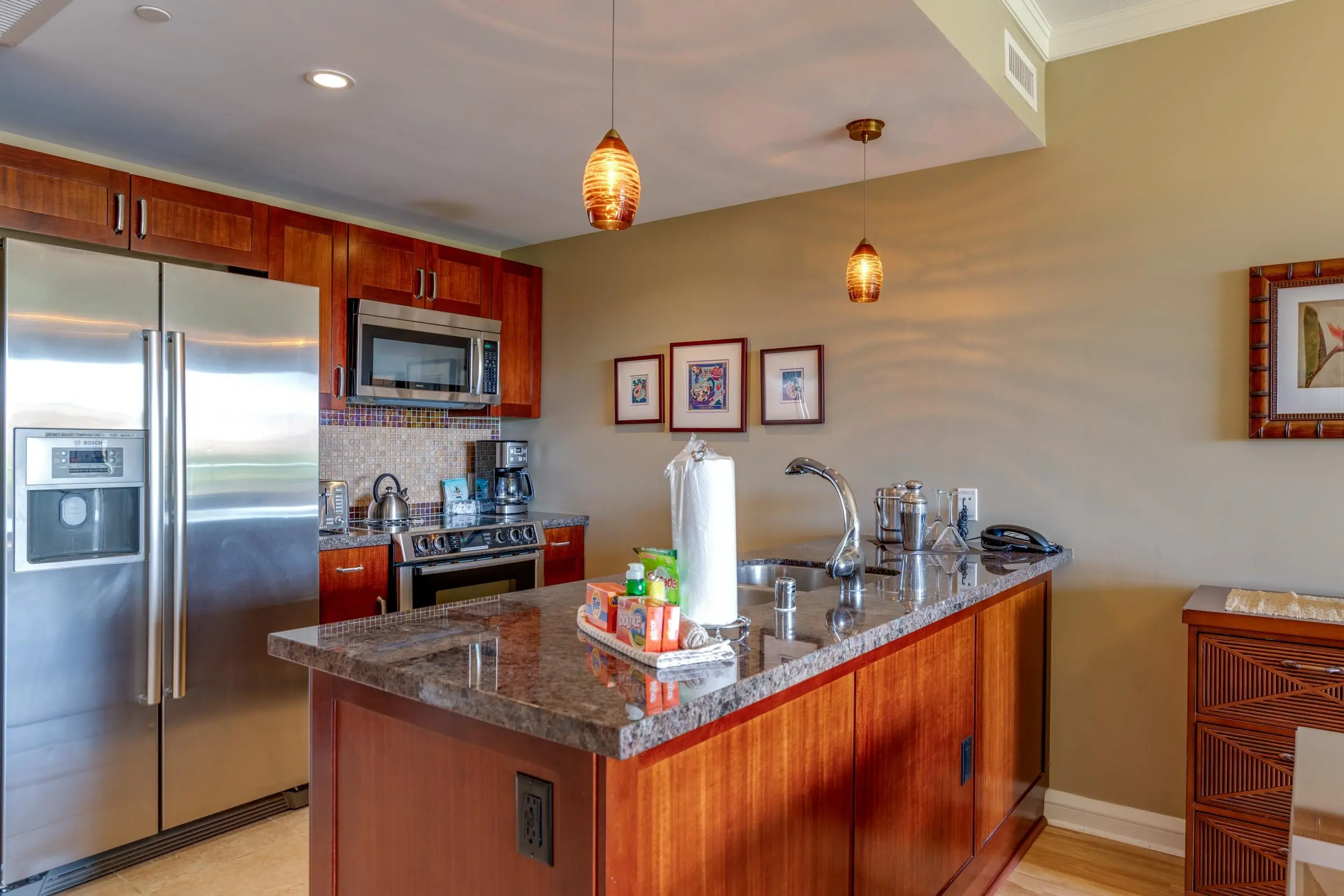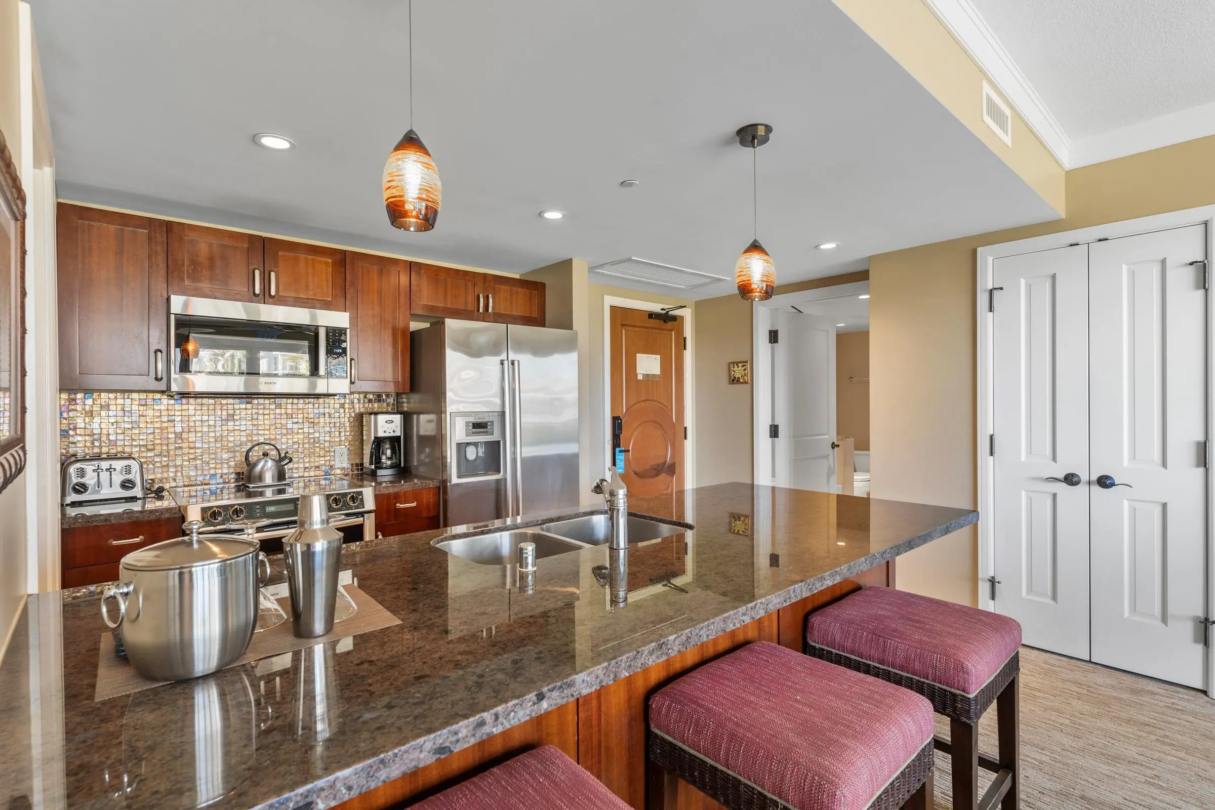 Each unit is air-conditioned, fully furnished, with private lanais, and complete with upscale gourmet kitchens that boast granite countertops and Bosch appliances. With linens and bath products provided, as well as laundry services, Wi-Fi, and coffee, you may never want to leave the privacy of your condo.