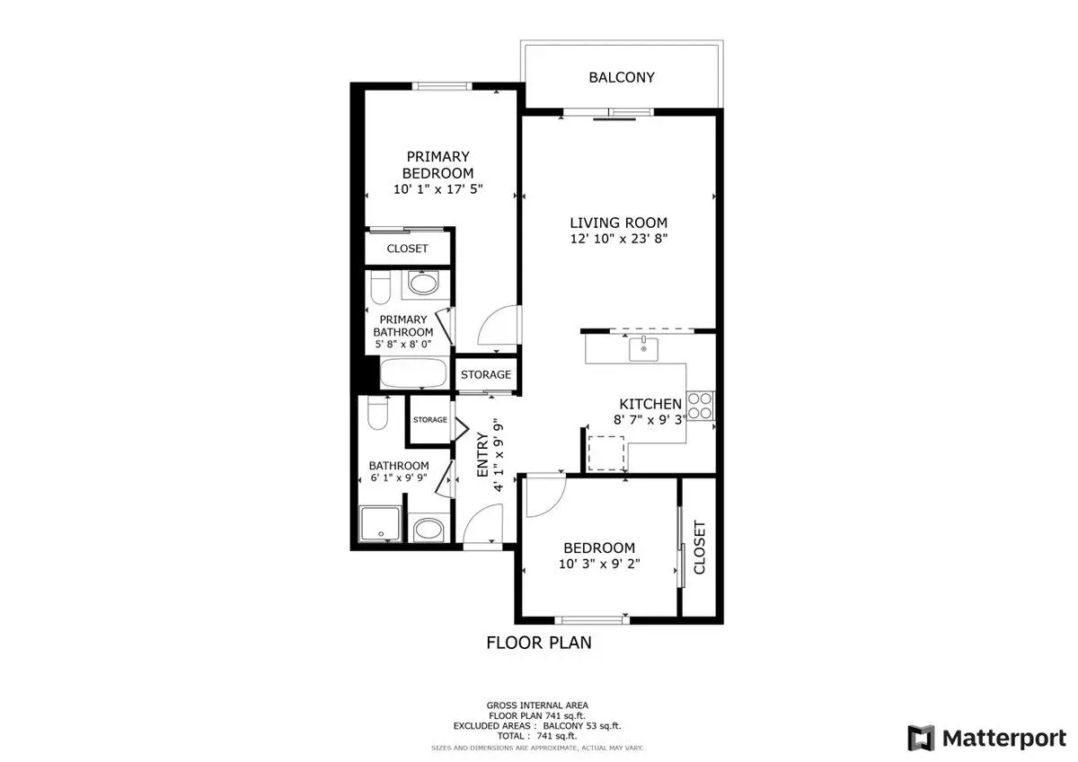 Finished living spaces range from approximately 597 square feet for an efficiency studio up to 1,035 square feet for a three-bedroom apartment.
