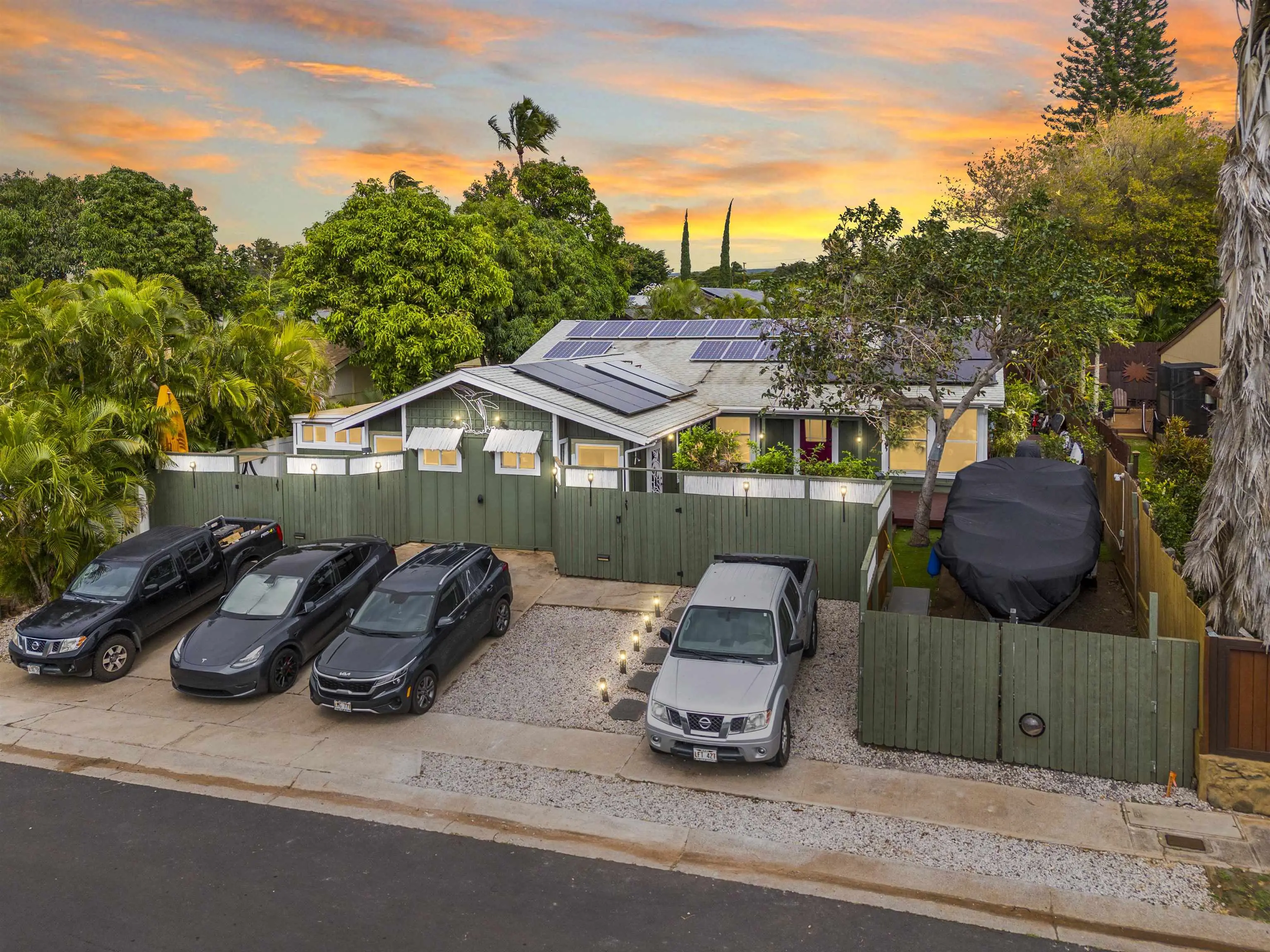 Live your best beach life in Kihei at 1679 Kahakai St! The home has 51 Photovoltaic panels, One tesla back up battery and charging station on a net metering plan currently the owner has no additional electric bill other than the Hawaii Electric basic monthly fee of $29.00. Great location in central Kihei with easy access to Kalama Beach Park, Kihei town, highway access and minutes to world class golf, beach, shopping and more. This 4-bedroom 2 bath home has an attached large one bedroom one bath ohana and plenty of parking (and currently boat parking!) This property is a total of 5 bedrooms 3 bathrooms and a total of approximatley 2270 sq ft. The main home has vaulted ceilings, vinyl plank flooring, crown molding and 2024 updated bathrooms. Three of the four bedrooms in the main house have exterior doors to enjoy the indoor/outdoor living with one bedroom currently being used as a den. The ohana space has a spacious kitchen, living space and it's own washer and dryer. Split Air Conditioning units throughout both units. A charming back yard setting with a fire pit, hot tub and easy care astroturf/grass. The yard is surrounded by solar lighting, decks, fruit trees and more. As you walk in you will see your very own avocado and Meyers lemon trees. Also on the property is Surinam Cherries, limes, papaya and tangerine. Call your favorite Realtor to make an appointment today!