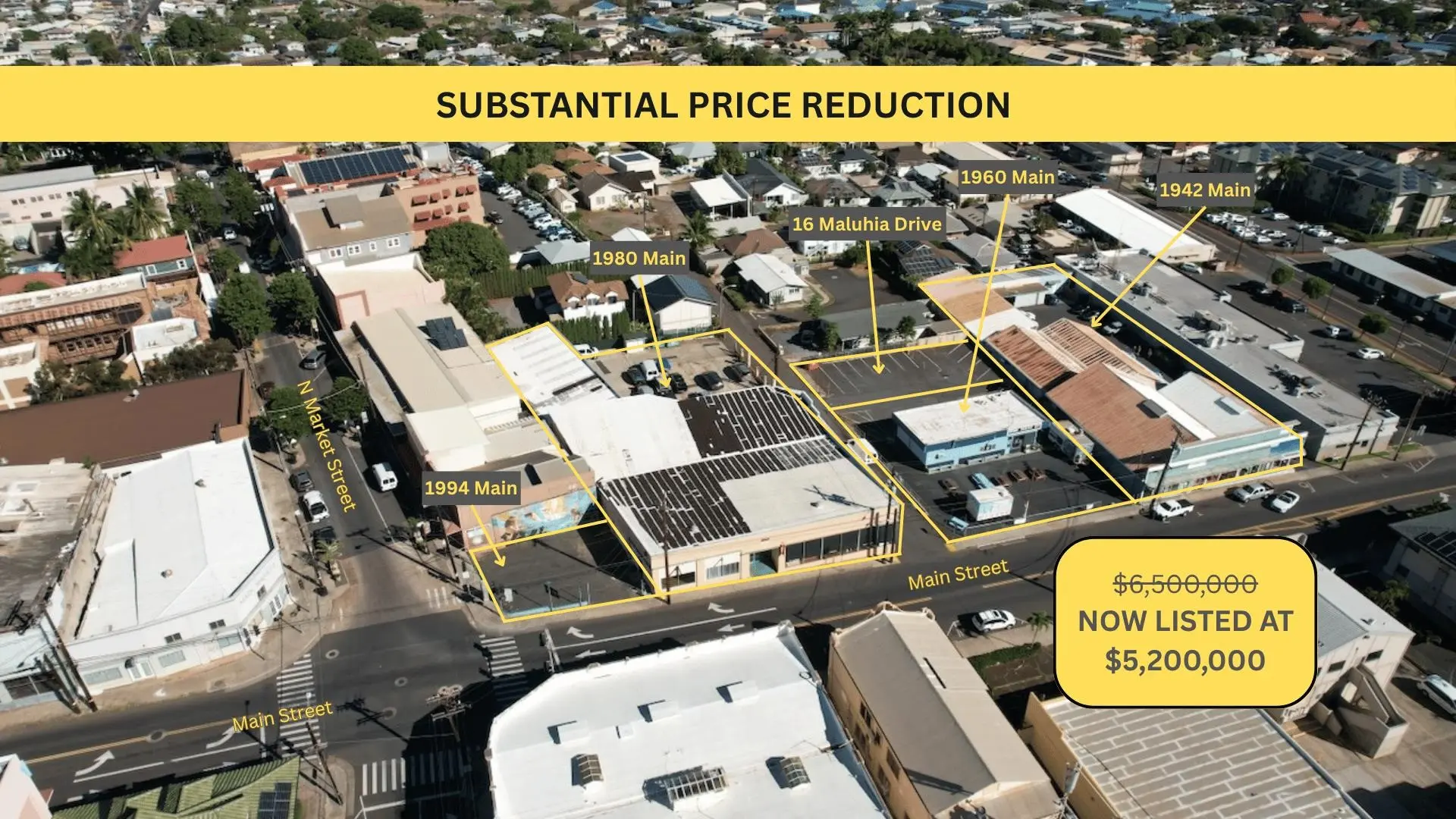 **Sale Includes MLS #s 401861, 401869, 401870, 401871, 401872** Located in the heart of Wailuku, these properties are in close proximity to the new municipal county parking structure with 393 parking stalls. This investment opportunity consists of five (5) separate TMK’s which could be consolidated for redevelopment. PROPERTY HIGHLIGHTS: Ample frontage along Main Street (estimated 341 ft) / Walking distance to the County and State buildings / Primary thoroughfare in the central business district of Wailuku / Commercial mixed use within the Wailuku Redevelopment Area and located within the opportunity zone / Great opportunity for a live/work development / Close proximity to the hospital, police station and UH Maui College / NOI $393,779 / B-2 Zoning **Includes** TMK: (2) 3-4-012-004 / 1942 Main Street / 22,154 SF Land / 4,200 SF (bldg 1) / 9,274 SF (bldg 2) TMK: (2) 3-4-012-006 / 1960 Main Street / 9,460 SF Land / 1,900 SF (bldg) TMK: (2) 3-4-012-016 / 1980 Main Street / 20,552 SF Land / 4,677 SF (bldg 1) / 7,899 SF (bldg 2) / 208 SF (bldg 3) TMK: (2) 3-4-012-017 / 1994 Main Street / 1,978 SF Land TMK: (2) 3-4-012-061 / 16 Maluhia Drive / 4,562 SF Land