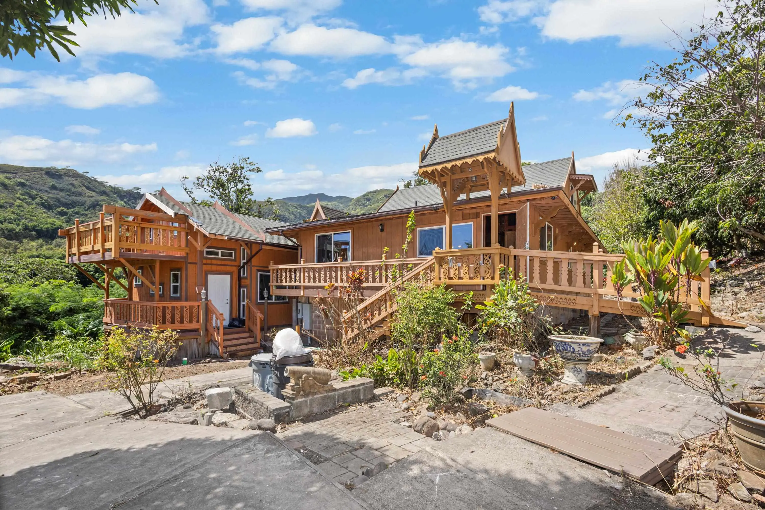 Own a piece of history! This is a unique opportunity to purchase a handcrafted Thai style home with ornate scrollwork and carvings throughout on 12.12 acres with city water, power and access to all utilities including cable in one of the most desirable and historic locations in all of Hawaii. Waihee is the valley where Queen Kaahumanu, wife of Kamehameha the Great, was raised. The valley that, in 1790, fed the armies of Kamehameha the Great and Maui King Kalanikupule as they fought in nearby Iao Valley in the fierce Battle of Kepaniwai. Who are The Four Waters of Maui? Within the song that Alice Namakelua wrote, “The Famous Waters,” are Waikapu, Wailuku, Waiehu, and Waihe'e. They are streams and, due to the great volume of water flowing from mountain to sea, the lands surrounding them were fertile and rich for cultivation. This land is a tropical fruit lovers paradise, sporting a huge grove of mature mango trees including Hagen, Ah Ping, Rapoza and Thai Mango varieties. Dragonfruit abounds, and Papaya, Bananas and Starfruit grow wild throughout the property. The backyard garden also includes several mature lychee and Jackfruit trees that produce heavy crops annually. The main home is a 3 bedroom, 3 full bath 2584 square foot structure with a great room living room, kitchen and dining area, a basement workshop, laundry and storage area, two finished lofts including one with a balcony that features views of the entire valley to the ocean. Off the great room you and your guests can enjoy a covered lanai with built in bench seating that overlooks the river below. You own the entire road from the highway to your back property line but it is maintained by the county because the water station is also on your property. Power, water and utilities are available not only at your house but also anywhere along the road. Your easement grants have allowed others to build below the main road, but you own all the property above the main road to the ridge. This land has at least five other suitable house sites should you wish to develop one or more them in the future, subject to all county permitting and buyers should conduct their own due diligence on the county process prior to initiating any such projects. Owning the upper right side of the valley from the road to the ridge means no one can ever obstruct your views of the valley, the ocean or both from these sites. Two of the potential homesites are located near the spot where your front property line angles toward the top of the ridge. The lower one has a beautiful old Banyan tree in what would be your back yard. The upper one has a sweeping panorama of the entire valley and ocean in a location that no one could ever obstruct. The other three potential home sites are deep in the valley above the existing home, the water station and just above the mango grove. There is also an existing pavilion in this area that is a great place to picnic, barbeque or entertain larger gatherings of friends away from the main home. This is a unique property that must be seen and walked to fully appreciate why you cannot find anything comparable on the market. Post and Pier under home been Paved with concrete floor, 450 sg ft work shop.