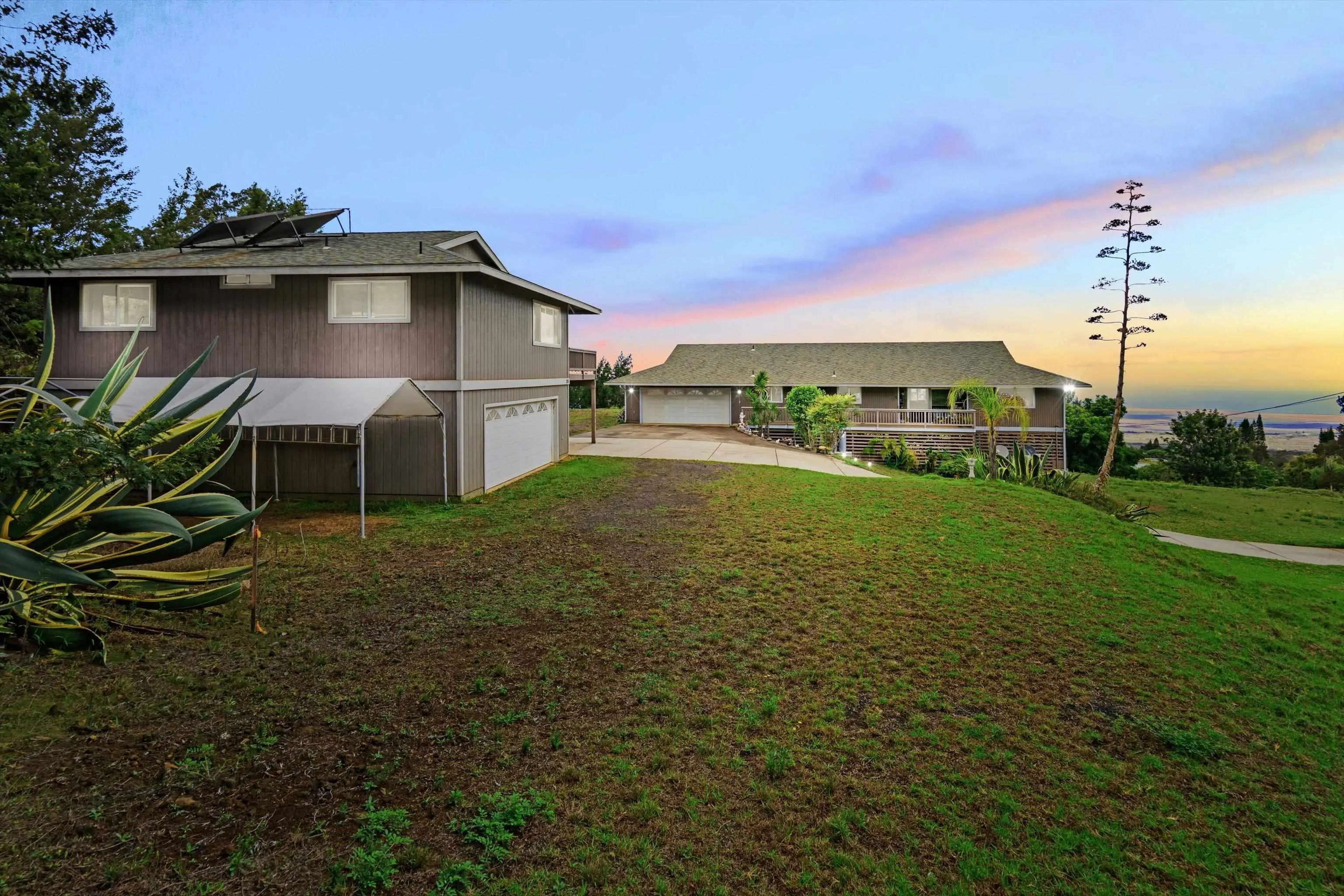 Set on 2.77 acres with sweeping ocean and mountain views, this Maui property combines natural beauty with convenience. Located in a sweet spot just minutes from Kula Elementary School, Morihawa Store, Kula Ace Hardware & Nursery, cafes, and other amenities, the property offers the perfect balance of rural tranquility and accessibility. The single-level main home features a wheelchair-accessible design, an open floor plan, a spacious kitchen with ample pantry storage, and a 759-square-foot garage. The detached two-story cottage includes two bedrooms, two bathrooms, and an expansive deck overlooking the serene surroundings. Its lower level offers an 884-square-foot garage with a half bath and flexible outdoor space for pets, a workshop, or recreation. At 3,100 feet elevation, the property enjoys a cool climate, abundant natural light, and open landscapes. The lower pastures offer plenty of room for additional agricultural or recreational use. There is a permitted extension of electrical and water stretches to the lower portion of the property. The survey was recently completed. Being sold As Is. Seller is downsizing and is motivated. Outlined perimeter photo is an approximate boundary for visual purposes only.