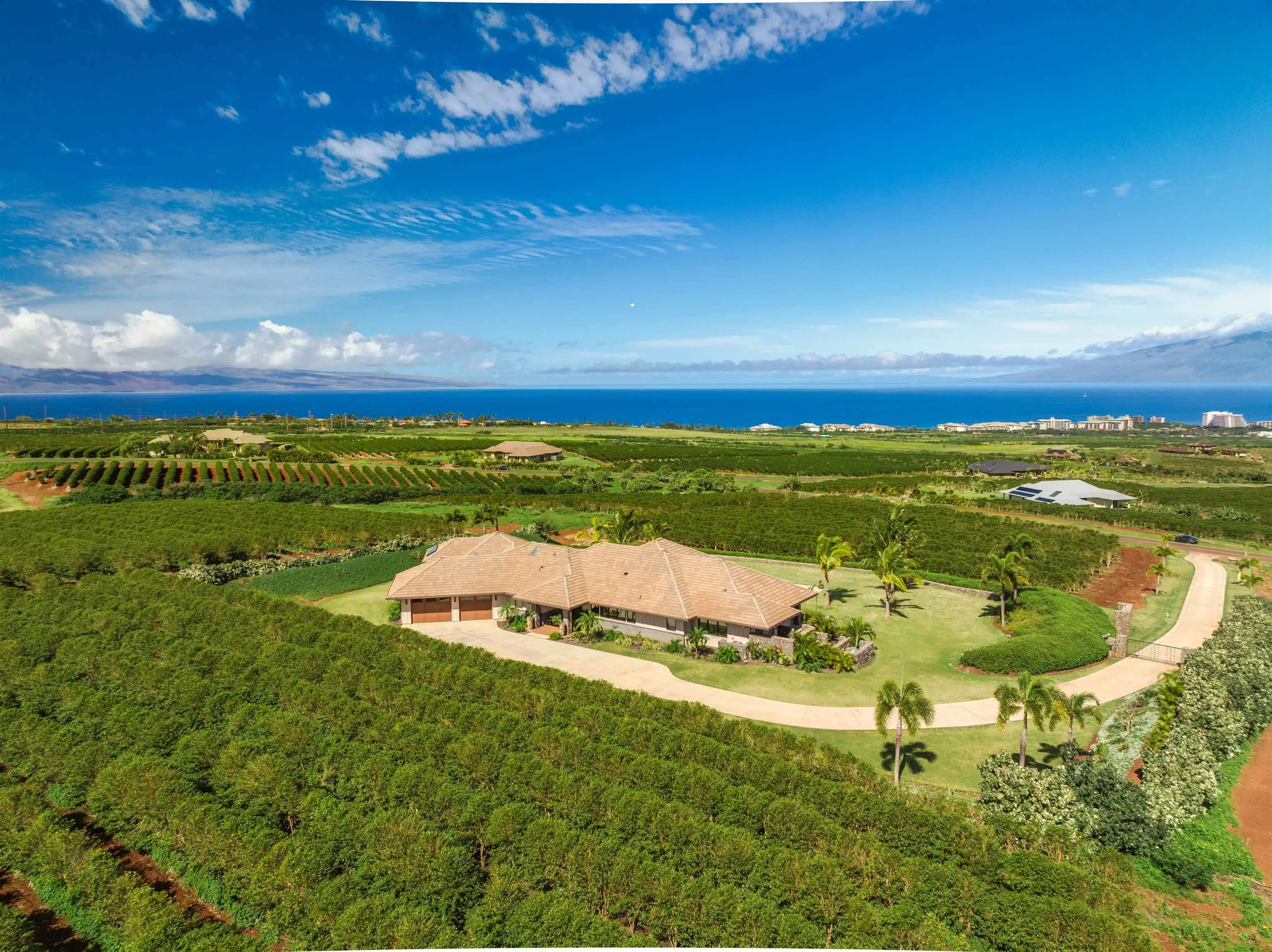 Check the boxes! Private location within the Kaanapali Coffee Farms gated community, open spaces, acreage, quality construction, premier lot with big-time views, high quality furnishings, and close proximity to all West Maui has to offer. This is a must- see property. Life goals and family priorities dictate a change in venue. The current owners purchased this 5 bedroom, 5 bathroom single level home as new in 2021 and then added additional designer touches and high end furnishings throughout, creating a thoughtful and comfortable home. The great room blends seamlessly with the chef’s kitchen and dining area and everything flows out to a large lanai featuring a barbecue area, pool and spa, and an expansive, well-manicured lawn. The north side of the home features a bedroom that has been converted to a stylish office, and large primary suite that leads out to a covered lanai. The bath is huge, featuring his and hers areas, soaking tub, and indoor and outdoor showers. The guest wing features a guest bathroom, laundry, over-sized garage with additional storage, as well as two additional bedrooms with baths. There is also a separate one bedroom, one bathroom plus living area studio detached from the main home but connected by a breezeway. The possibility of uses for this space are endless. The views from the property are breathtaking, from the verdant West Maui mountains to the east, the rolling fields of coffee, the beautiful blue Pacific Ocean and the outer islands of Molokai and Lanai. If you love sunrises, sunsets and stargazing, this is an amazing location. Maui Grown Coffee takes care of the agricultural component.