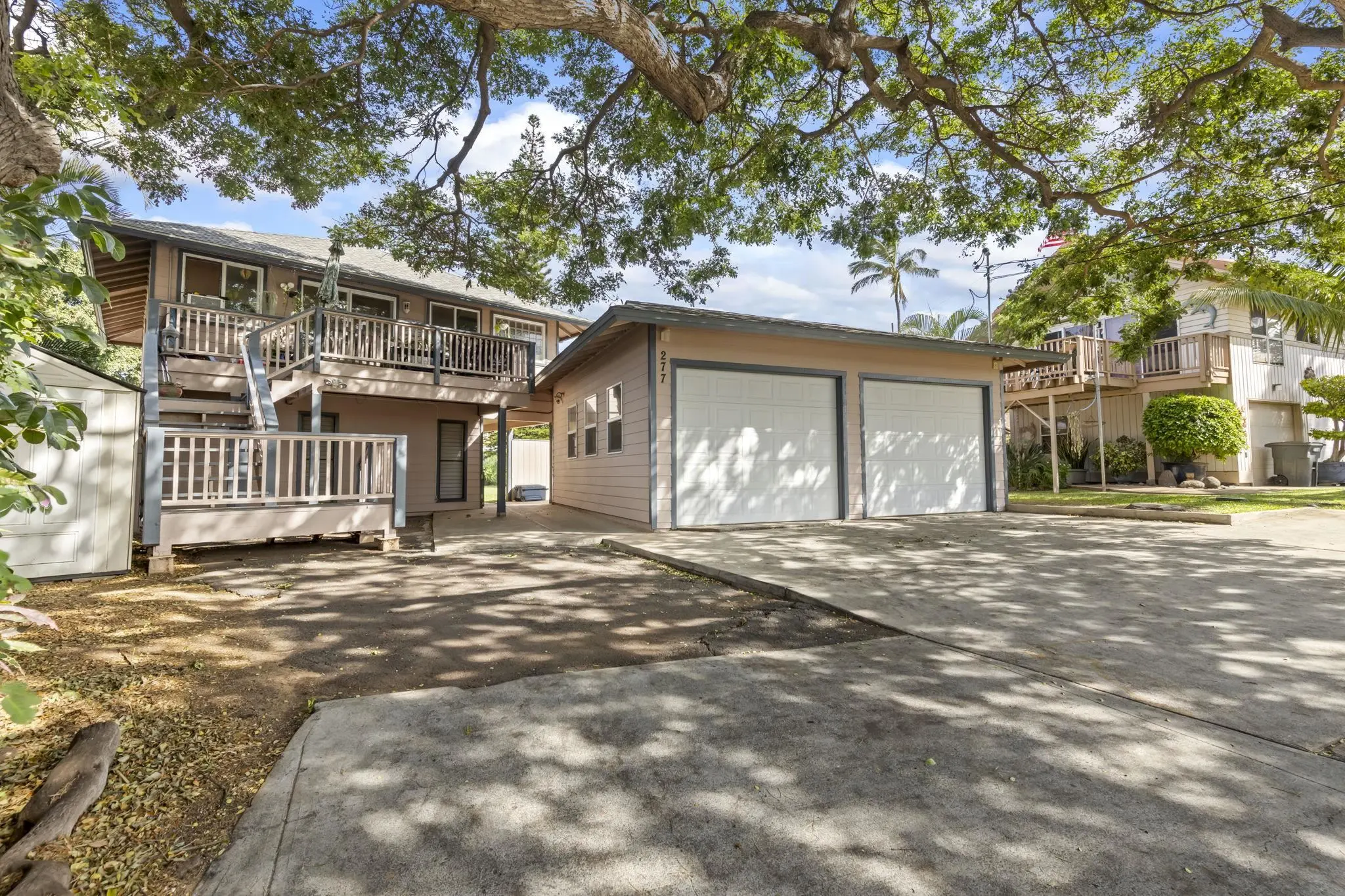 Tucked away on Keonekai Rd, 277 Keonekai Rd has a spacious 3-bedroom, 2-bathroom main home and offers flexible living options with an attached ohana. The door between the two spaces can be unlocked to create a generous 5-bedroom, 2 floor layout. Enjoy the large backyard and two-car garage, plus an extra storage room with Laundry facilities for the Ohana. A peek of ocean view from the dining room adds to the appeal of this Maui home, blending comfort, convenience, and versatility.