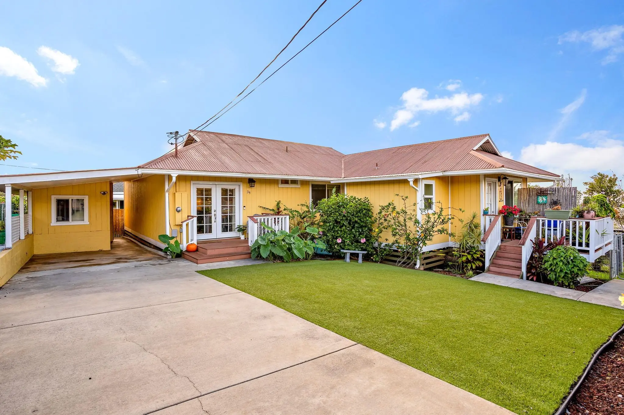 Welcome to your quintessential plantation style home conveniently located in the heart of Makawao Town. Built in 1947 and completely remodeled in 2017, enjoy the old Hawaii style charm with the updated conveniences of new appliances, new luxury vinyl plank flooring, blinds and a freshly painted interior. This 4 bedroom, 3.5 bath home offers a rare investment property opportunity to live in the 3 bedroom, 2 bath main house and to rent out the attached studio. Three lanai's with Trex decking provide private outdoor living space, and the zero maintenance Syn Lawn front yard is fenced-in and surrounded by a hibiscus privacy hedge. A covered carport and two separate driveways provide ample parking. An additional locked storage room and a separate laundry room are attached to the carport. 34 Ai Street is ideally located just moments to boutique shops, cafes, restaurants, art galleries, schools and the Eddie Tam recreation fields in Makawao.