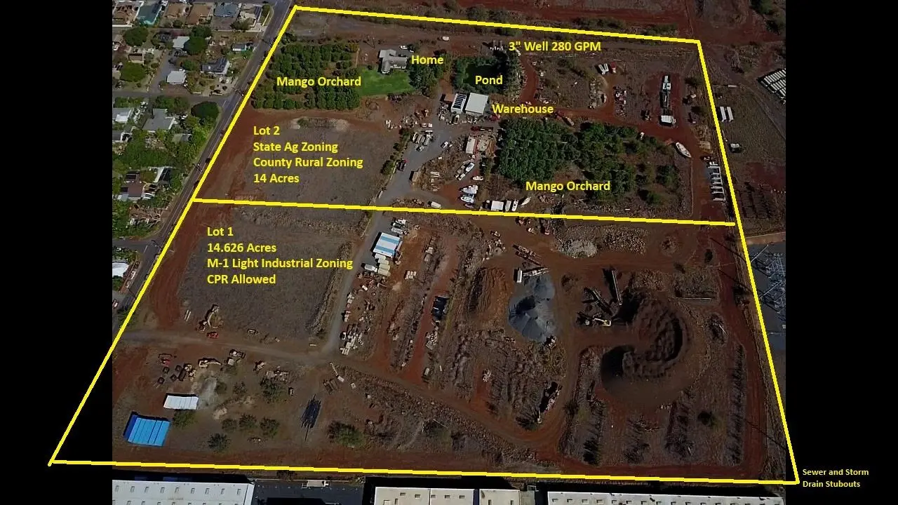 Large 28+ acre Light Industrial M-1 Zoned property in the heart of Kihei. Property qualifies for Apartment Zoning as well with public meeting. 42" Storm Drain Stubbed to property. 8" Sewer Line Stubbed to Property. CPR allowed on Property. Perfect location for leased Light Industrial park lots or CPR and sell individual lots. Lot is approximately 135' above sea level at the top and 100' above sea level at the bottom. 14+ acres zoned M-1. 14 Acres Zoned Ag/Rural. 1" Water Meter and 5/8" Water Meter plus 3" well that produces 280 GPM. 3 Bedroom Lindal Cedar home and 50x25 Warehouse. Owned PV System with 5 Powerwalls and 41 Panels. 2 Mango Orchards.