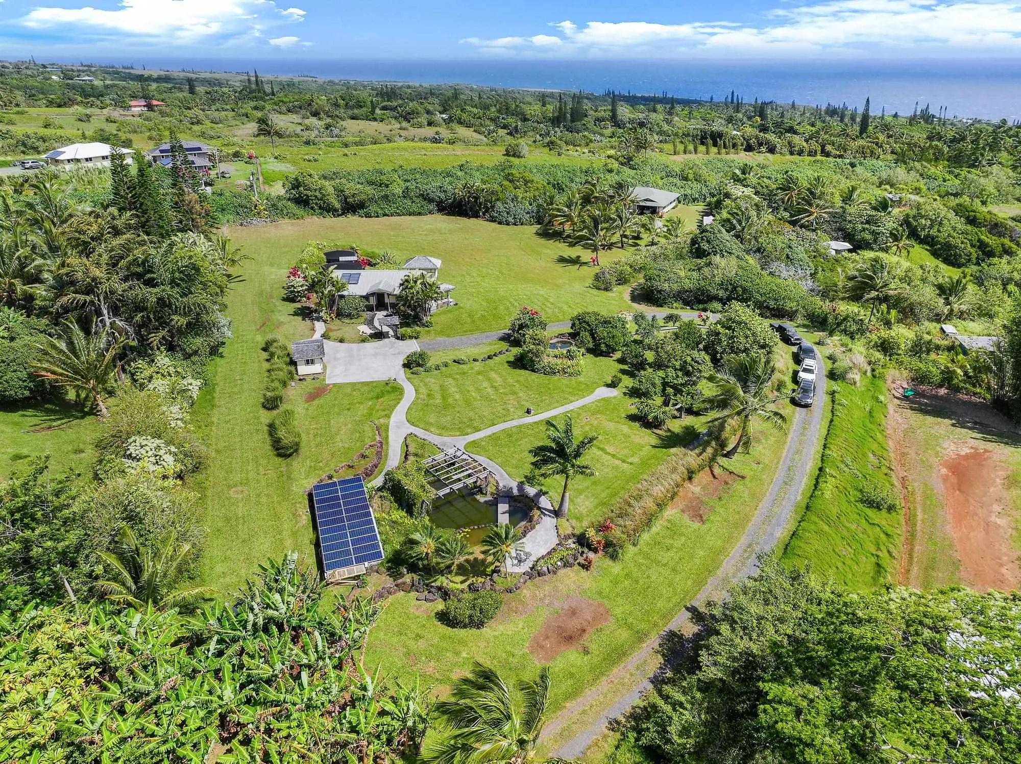 Rare Seller Financing Opportunity. One-of-a-Kind Maui Estate Offering Luxury, Sustainability and Income Potential Set on 2.34 private acres with panoramic views of Haleakala and the Pacific, this meticulously maintained 2011-built estate blends refined luxury with modern eco-conscious living. Offered fully furnished including kitchenware, power tools, and farm equipment, this is a true turn-key opportunity. At the heart of the home is a Control4 smart automation system providing centralized control over tri-zone Sonos entertainment, climate, lighting, security, water features, and more, all accessible via in-wall touchscreens and smartphones. A gated entry with smart intercom and fiber-optic internet ensure privacy and seamless connectivity. Sustainable features include solar panels with backup batteries, a Level 2 EV charging station, and an advanced rainwater catchment system with RO and UV purification. Outdoors, the estate is a working sanctuary with 28 varieties of fruit trees, an aquaponic system, and exclusive rights to a Geodetic network station generating $1,000 in annual passive income. Previously approved plans for a second dwelling provide added flexibility. This high-tech, self-sufficient and gated retreat is a truly rare offering on Maui, especially with the option for seller financing.