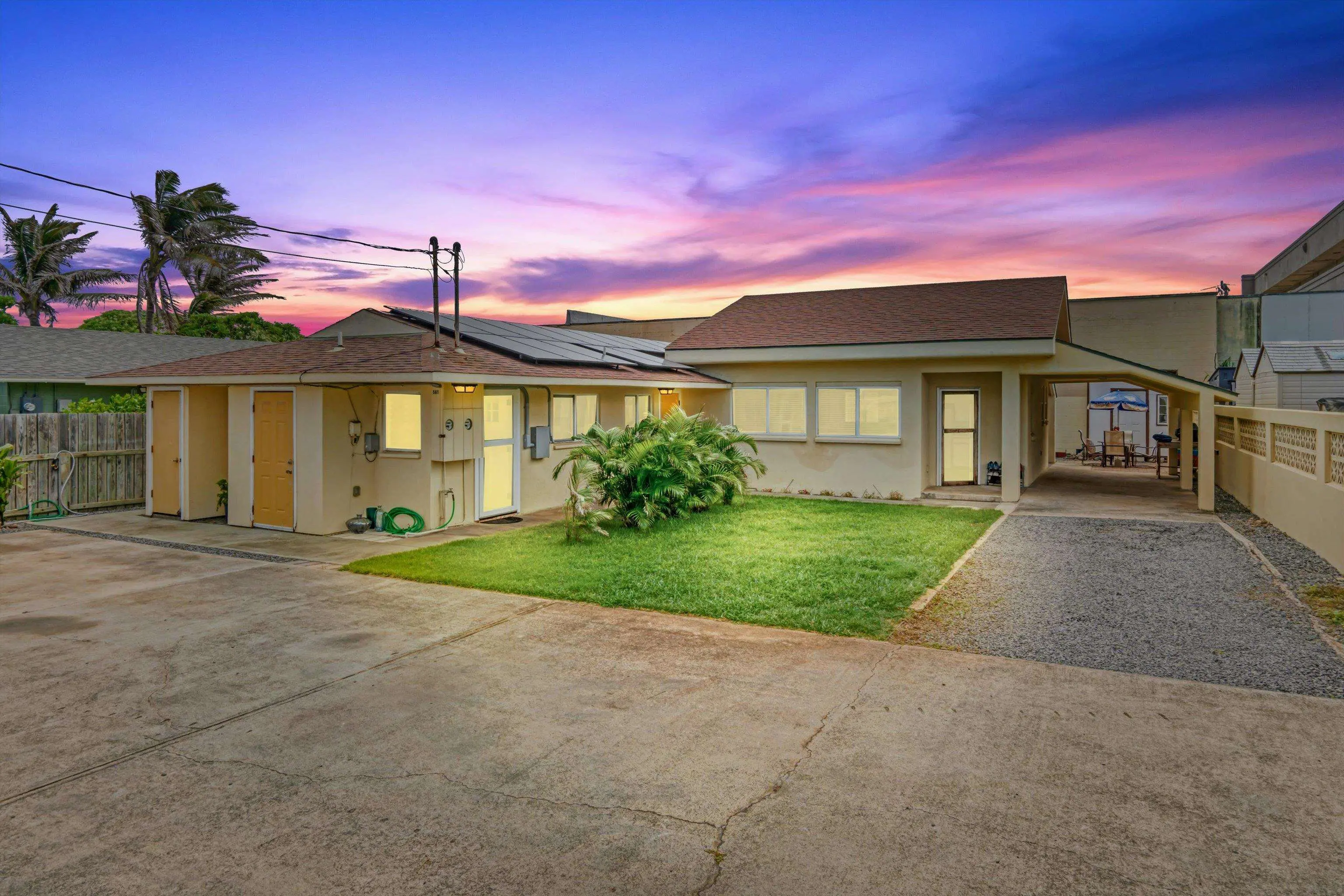 Rare Multi-Dwelling Gem Near the Ocean in Central Maui! Just a few homes from the shoreline, this charming and versatile property is a dream for ocean lovers and those seeking mufti-generational living or rental potential. The main home offers approx. 936 sq ft of bright, open-concept living with 2 bedrooms and 1 bathroom. Attached is a spacious, non-conforming unit (approx. 920 sq ft) featuring 1 bedroom and a large bathroom-perfect for guests, extended family, or flexible use. Enjoy peace of mind and energy savings with 16 owned photovoltaic panels installed in 2023-complete with separate electrical meters and a fully transferable warranty. Unwind beneath the large covered lanai overlooking a private, low-maintenance backyard, ideal for entertaining, gardening, or simply relaxing. There's even space to grow herbs. fruits, and vegetables-with new irrigation and drainage system already in place. A generous parking area, including a tandem-style carport (approx. 324 sq ft), offers ample room for multiple vehicles. Conveniently located near shopping, schools, parka, restaurants, and The Maui Arts & Cultural Center-this property combines lifestyle, flexibility, and location in one unique opportunity!