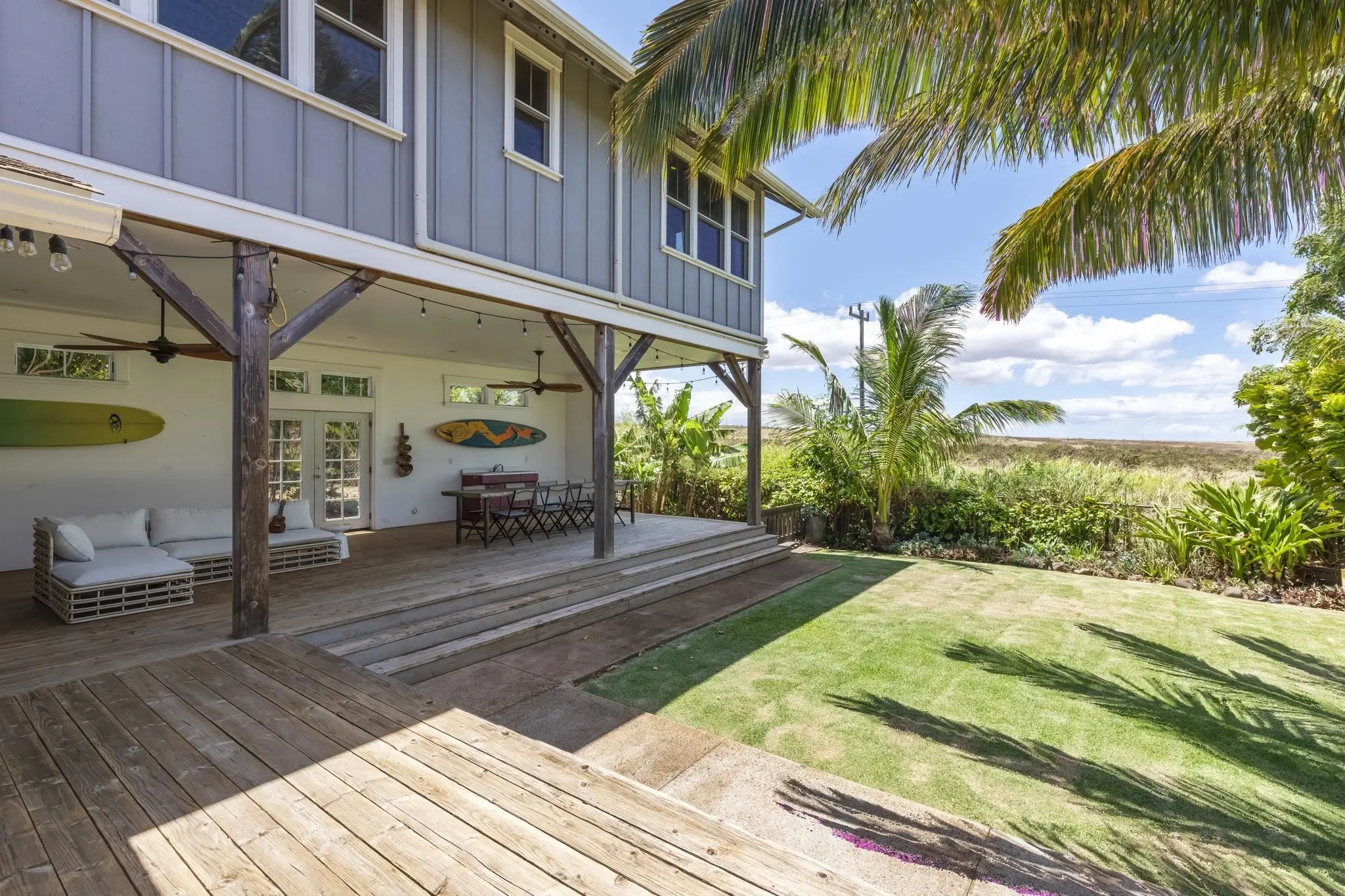 This North Shore Maui home is the perfect blend of style, function, and location. 592 Pili Loko is a thoughtfully designed 4-bedroom, 3 bath home with an easy flow and countless special features. An ideal property for entertaining or relaxing, the kitchen and living room open to a spectacular 600 square foot covered lanai and beautifully landscaped, fully-fenced back yard with panoramic island views. The kitchen is a dream, with abundant storage, monkeypod finishes, poured concrete countertops, and an oversized island. The bright and spacious primary suite upstairs has high ceilings, large windows, custom built-in closet and fixtures, en-suite bathroom, and huge bi-coastal and mountain views. Adjacent to the primary suite, you'll find another generously sized bedroom and a modern bathroom. Two more bedrooms are downstairs, one of which conveniently connects to a dual-entry bathroom accessible from the main living space. Hardwood floors, net-metered solar PV, five split AC units, and Pacific Millworks fine custom cabinetry and woodwork throughout. If youâre looking for even more space, plans have already been drawn to build a bonus room, laundry, and deluxe storage space for all of your surf and water-sports gear. Located in Skill Village just one mile north of Paia town, live your best North Shore lifestyle. World-class beaches, surfing, boutique shopping, dining, and easy access to a wide range of schools are just moments away, making this the perfect spot to call home.
