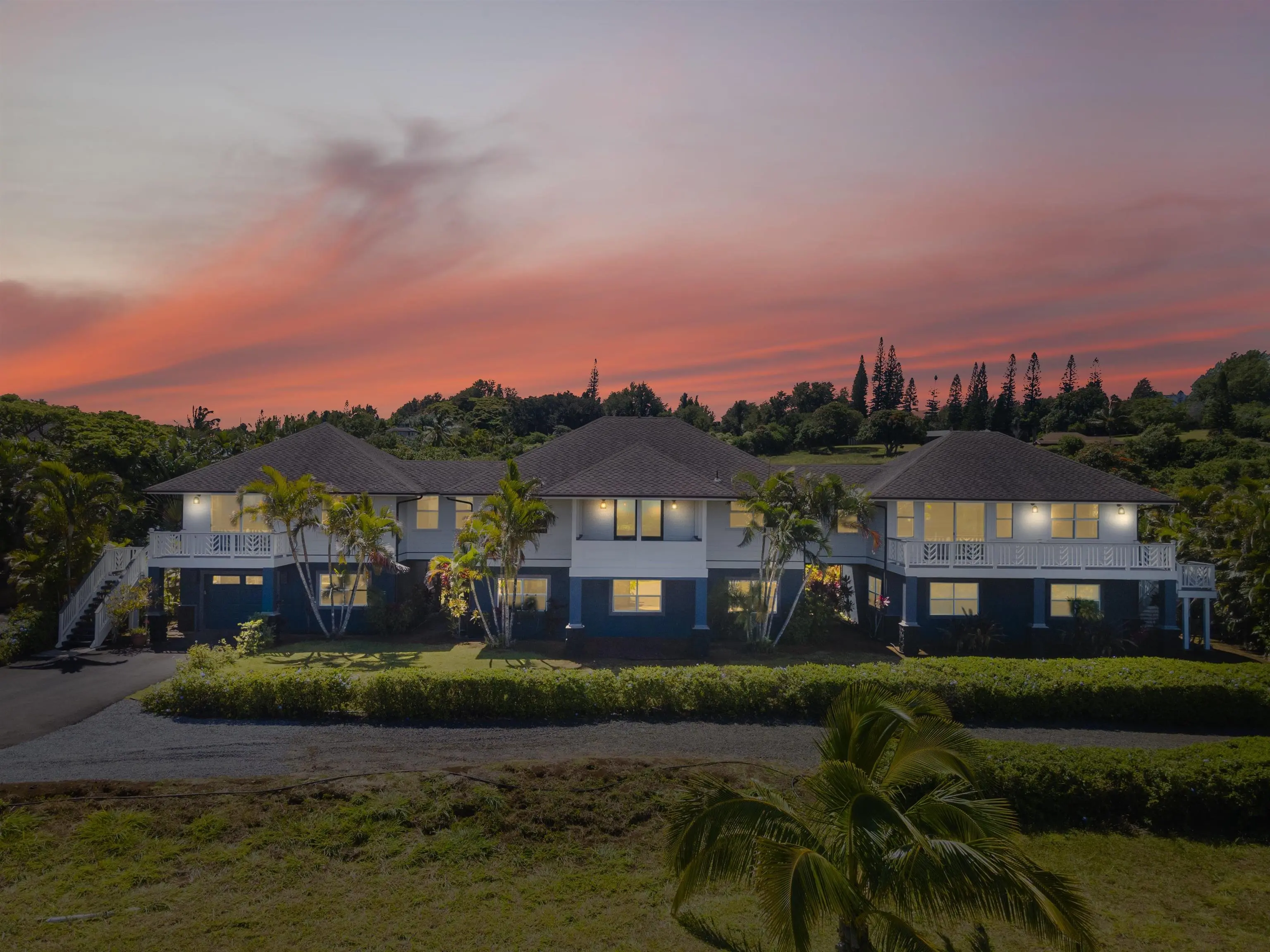Exquisite Upcountry property located between the charming towns of Paia and Makawao in the gated Mauna'olu Plantation. This expansive 5 bedroom, 4 bathroom residence unveils an exceptional living experience. Showcasing an ingenious floor plan, the main home encompasses two lavish primary suites, each completed with additional generous lounge areas. The inviting living spaces and bedrooms have breathtaking, unobstructed vistas of the boundless ocean and majestic West Maui mountains. Encompassing the lower level of the main dwelling are three distinct garages, offering a myriad of possibilities for parking, gear storage, or the creation of a private fitness sanctuary. Situated at the end of a long driveway, this main residence is complemented by a stylish 3 bedroom, 2 bathroom cottage with a large covered lanai and courtyard, as well as its own detached garage, and separated from the primary residence by an expansive yard. Distinguished schools, delectable dining options, and a myriad of shopping destinations are all within close proximity. Moreover, the stunning beaches and thrilling water activities of the North Shore are but a short drive away, adding an alluring dimension to the unrivaled lifestyle provided by this remarkable property. Discerning buyers seeking a harmonious blend of tranquility, convenience, and refined elegance need not look further. Embrace the opportunity to call this extraordinary property home.