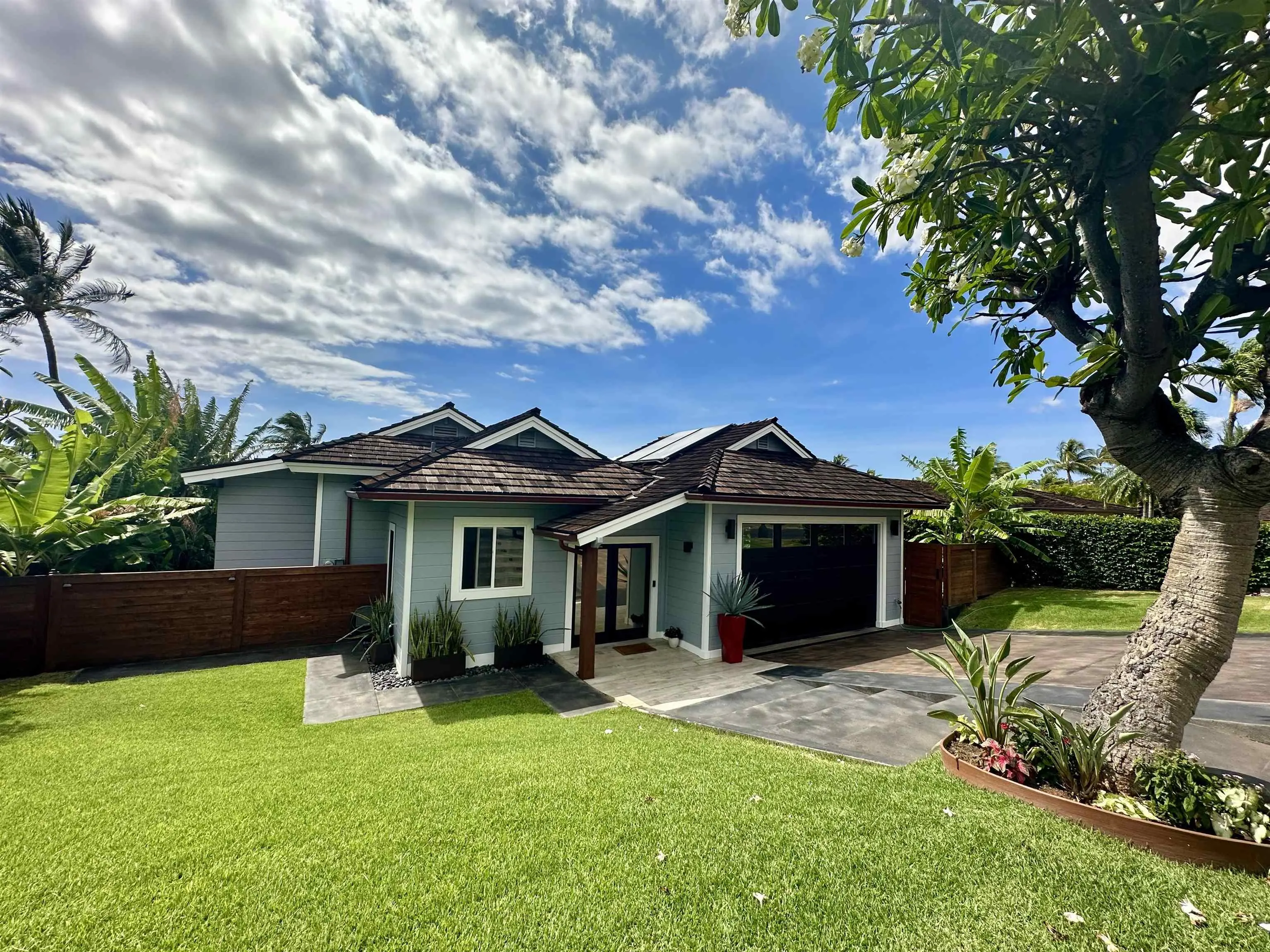 This classy & charming home in Wailea Kai was tastefully updated in 2022 and a delight to see! The main living and kitchen area is very light and airy with high open beam ceilings. The sliding glass doors open to the outdoor decks to view the landscaped back yard and views of the West Maui mountains. The kitchen has fabulous light grey cabinets, good lighting and excellent work area. There are newer stainless-steel appliances, an island including an induction cook-top, storage and breakfast bar seating. The open living/dining area is great for entertaining with easy access to the side deck BBQ area and a second large deck with comfortable seating to enjoy a peak of ocean view, watch sunsets or star gaze! The lower level continues the light and open theme with the primary suite having a walk-in closet and modern bathroom with separate tub & shower. The additional 2 bedrooms are nice size, and each have en-suite baths that were fully remodeled with a contemporary blend of tile, glass and wood. Each bedroom opens to the outdoor lanai and private fenced back yard. The welcoming entry area has a guest bath, extra storage and access to the garage. The home has split AC, tile floors throughout, solar hot water and everything is in excellent condition. Wailea Kai is a gated community with a large park and an easy walk to Keawakapu Beach and close to all the Wailea amenities with golf courses, shopping & restaurants. This sale is subject to seller finding a replacement property.