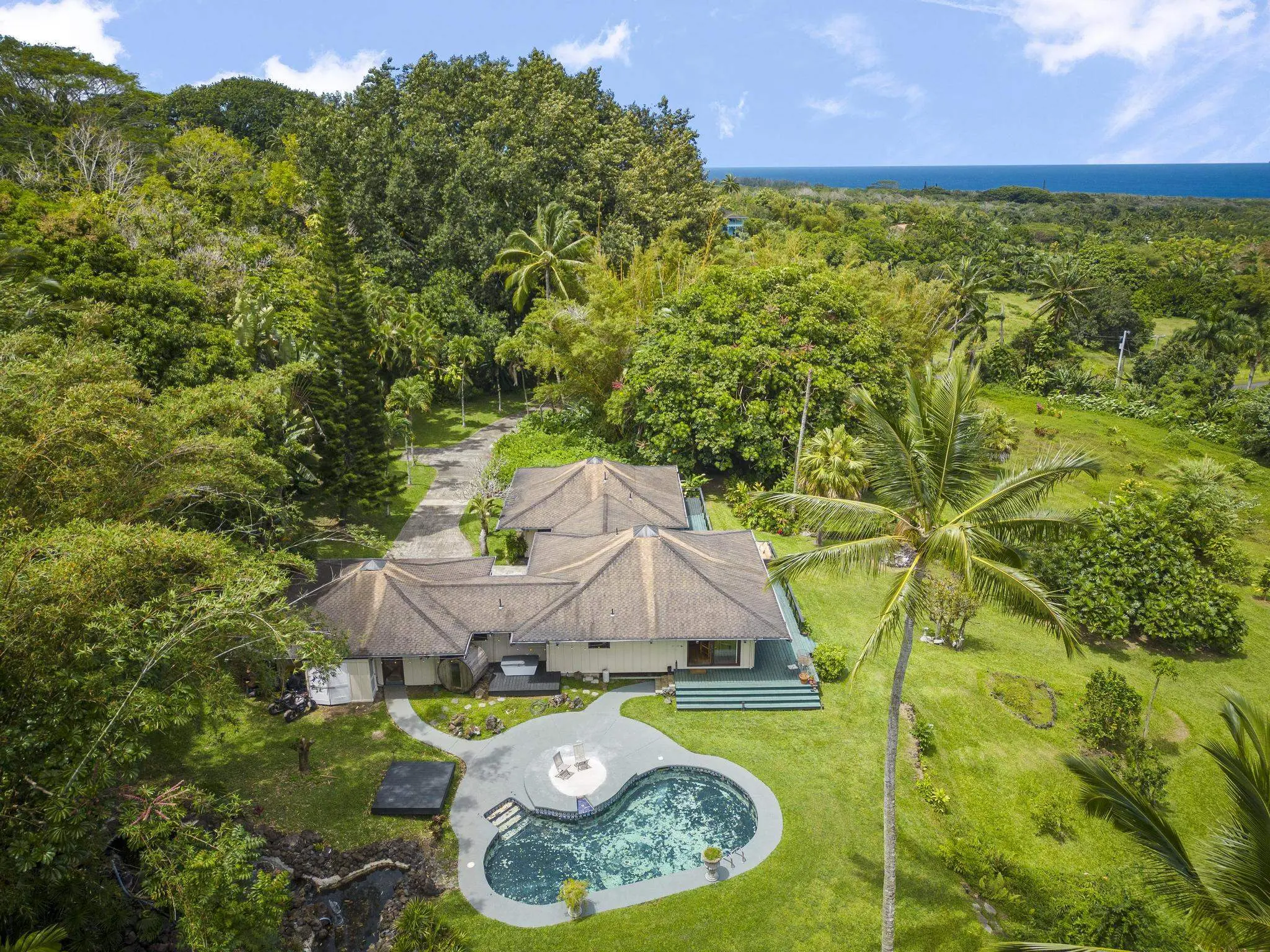 Hidden Hana Shargrila is a lovely and peaceful home situated in a rural setting. The property offers the perfect opportunity for a getaway home or a rural lifestyle. The one-level home with its soaring ceilings and open-plan living room provides a spacious and comfortable environment for relaxation and entertaining. The over 1600sf deck allows for indoor/outdoor entertaining, creating a perfect setting for gatherings with family or friends. The swimming pool provides a refreshing oasis after a day of hiking the Hana trails or simply relaxing and soaking up the sun. The chef-inspired kitchen with its granite counters, wood cabinets, and pantry is perfect for preparing meals with local produce from Hana. The property's fruit trees and tropical flowers add to the property's beauty, providing a serene and tranquil environment. Overall, this hidden Hana Shangri-La offers the perfect opportunity for a peaceful and relaxing lifestyle away from the hustle and bustle of city/suburb living.