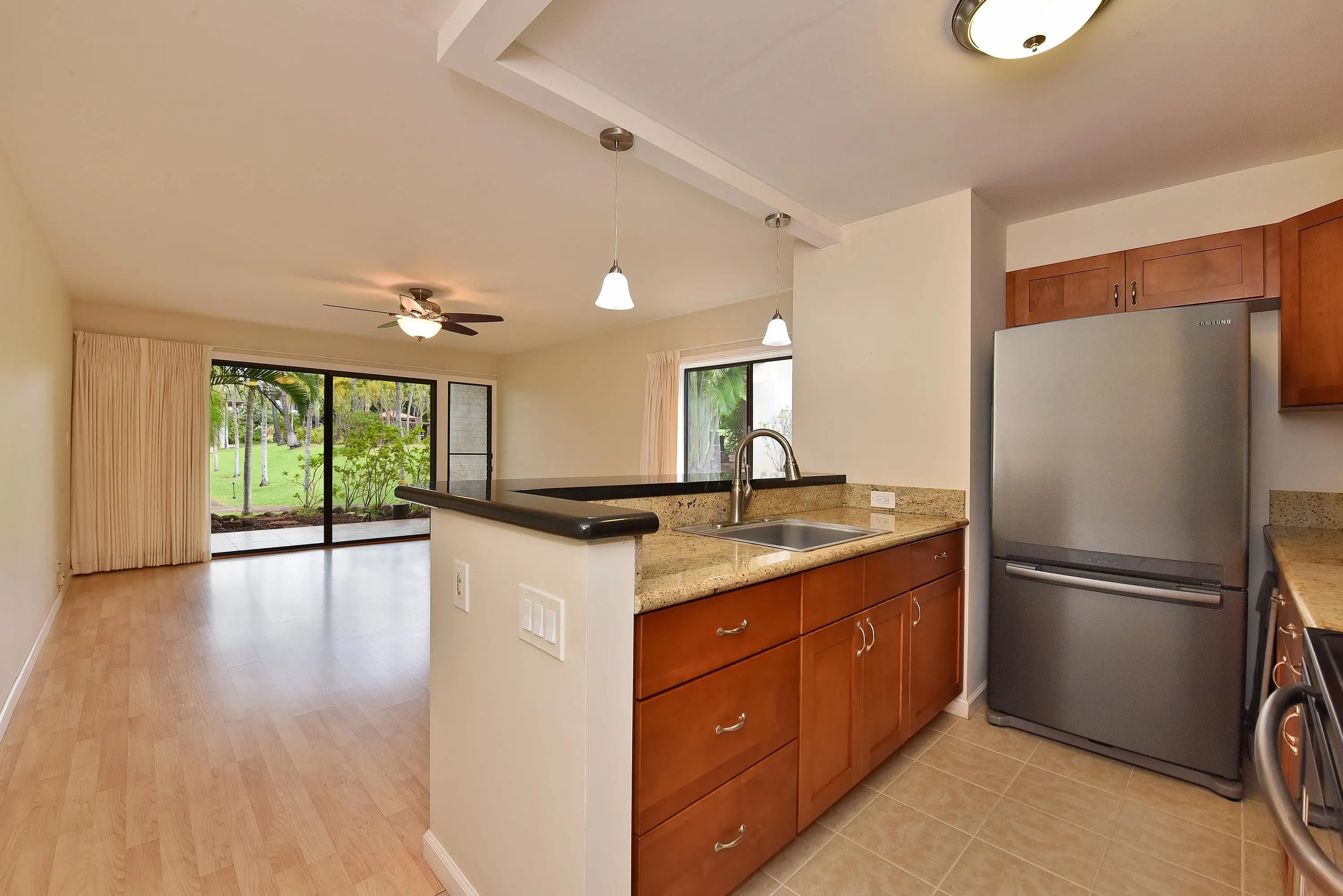 Welcome to your serene oasis at Hale Royale, West Maui! This beautifully remodeled garden view studio is a perfect blend of comfort and style. Step inside to discover elegant laminate flooring and sleek tile accents throughout. The modern kitchen boasts granite countertops, wood cabinets, and stainless steel appliances. The end location in the building gives you a bonus side window offering beautiful natural light. The walk-in shower, and the convenience of an in-unit washer and dryer enhances your living experience. The inviting lanai area offers stunning views of the lush landscaping, creating a peaceful retreat where you can relax and unwind. Unit comes with one parking stall located in front of the unit. Hale Royale is a wonderful community with amenities that include two sparkling pools, a soothing spa jacuzzi, a sauna, and a BBQ area, perfect for gatherings with friends and neighbors in the party room. There is also a tennis court and a community laundry. This property is an exceptional opportunity for owner-occupants seeking a tranquil lifestyle or investors looking for a long-term rental in a prime West Maui location. Don't miss out on this charming studio that embodies the best of island living! Please note three of the photos are virtually staged.