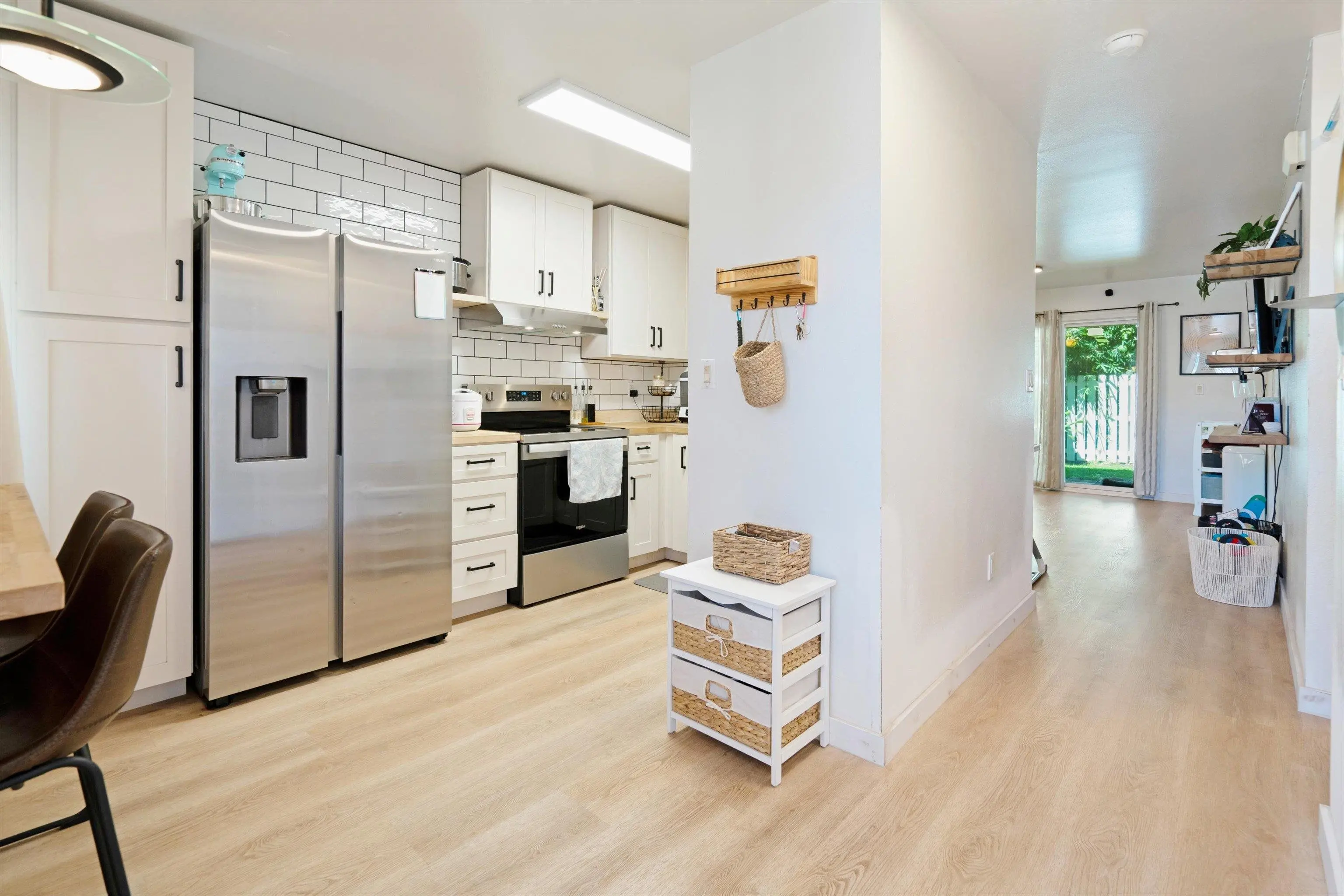 Step into comfort and style with this beautifully updated ground-floor 2-bedroom, 2-bathroom unit. Recent upgrades include new flooring throughout, wood block kitchen countertops, modern cupboards, a stylish tile backsplash, and stainless steel appliances—perfect for the home chef. Enjoy energy efficiency with new double-pane vinyl windows and a brand-new water heater. This bright and inviting home also features a great location on the perimeter of the complex which offers a semi-private backyard, ideal for relaxing or letting your furry friends play freely and is situated to benefit from the refreshing tradewinds to naturally ventilate the space. Centrally located, you'll be near a park, restaurants, shopping, and medical facilities. Move-in ready and full of charm—don’t miss this one! Unit has 2- deeded side by side parking stalls #133 & 134 near the unit entrance. Shown by appoinment only.