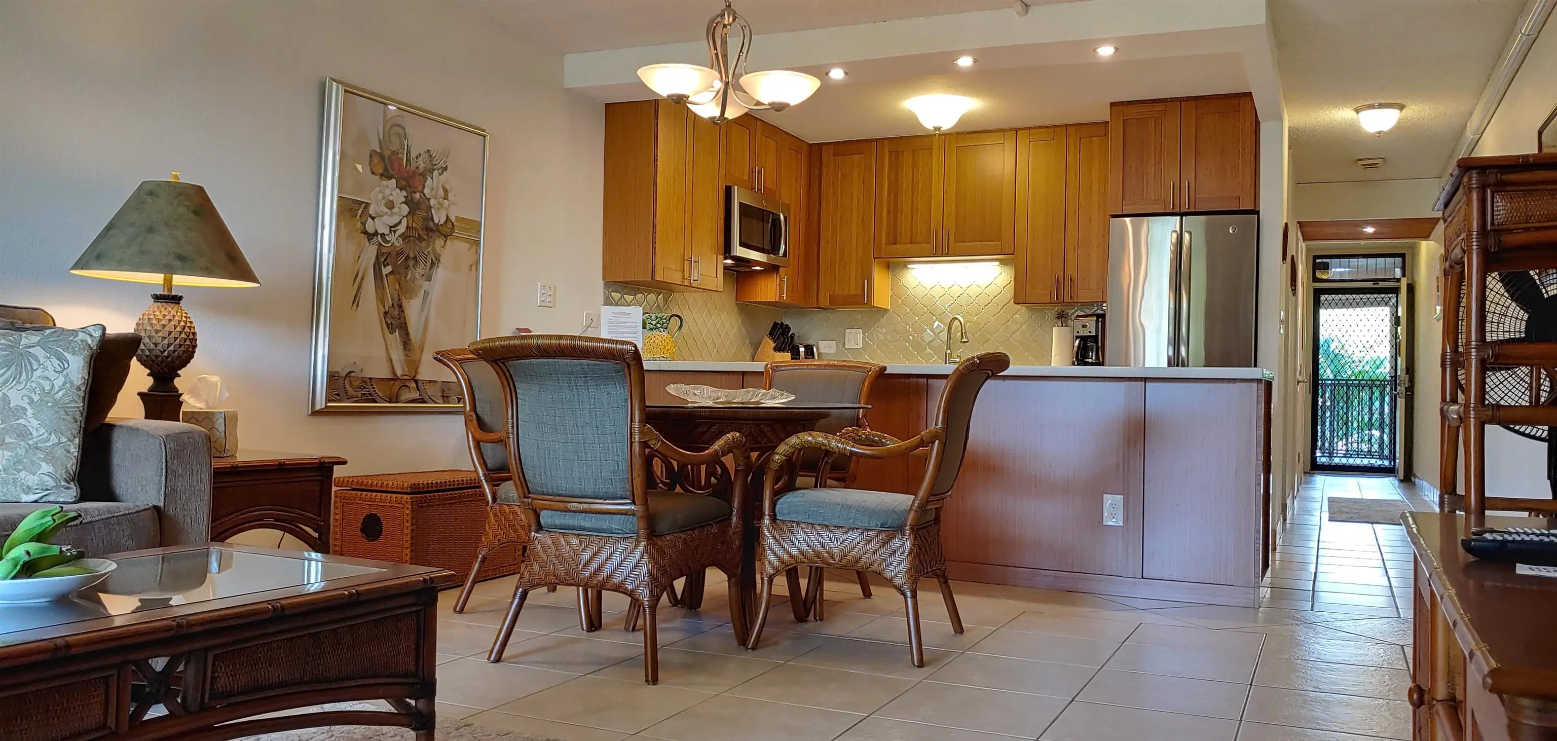 This is a beautifully remodeled, inner-courtyard unit, with the larger lanai and money-saving split system air conditioning units. In the open-plan kitchen you'll find quartz countertops, an elegant arabesque glass tile backsplash, bamboo cabinets and stainless steel appliances. Bathrooms have granite countertops and glass shower/tub surrounds. It comes fully furnished with tropical-themed furniture so you can hit the ground running with your short-term vacation rental. A like new, pull-out sofa means this condo sleeps four. The owners installed a programmable lock to allow for remote control access. Kamaole Sands is located across the street from Kamaole Beach Park III and within walking distance to restaurants and shopping. The complex has a swimming pool, wading pool, and two hot tubs, a fully equipped gym, four tennis courts, parking for your paddle boards and kayaks, and several grilling stations. Poolside concierge can assist with your vacation plans and rent sanitized snorkel gear. Kamaole Sands' onsite vacation rental company can manage your vacation rental unit, or you can choose to go another route.
