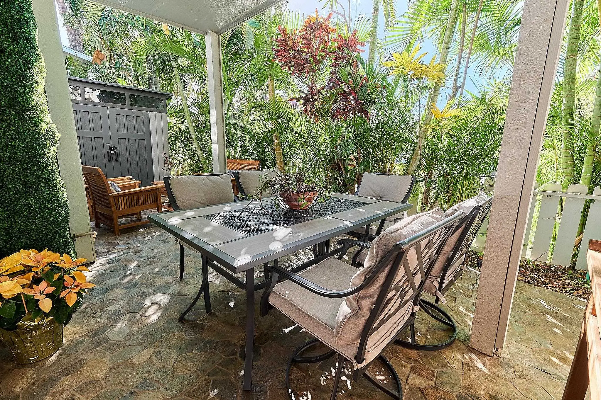 One of the nicest homes ever offered for sale in one of South Maui’s most desirable condominium communities - Keonekai Villages!! Rarely available Owner-occupied and extensively upgraded west-facing ground floor 2 bedroom, 1.5 bath condominium home – featuring one of the most spacious and liveable outdoor lanais in the complex. The lanai indulges guests with covered dining and comfortable entertaining under a beautiful tropical tree canopy that provides year-round cool shade and privacy to the entire space. Upgrades inside include a chef’s dream kitchen with top-of-the-line KitchenAide appliances, and full-size Asko stacking washer and dryer. Keonekai Villages is a highly-coveted South Maui location and low-density community. The community welcomes family pets and is conveniently situated right next door to Keonekai Park – perfect for picnics, dog-walking and play. The most desirable feature is that from this location you can simply grab your beach chairs and wagon and stroll down to Kamaole Beach Park III for swimming, snorkeling and nightly sunset cocktails on the beach. Keonekai Villages is also only minutes away from Wailea’s world-class shopping center, entertainment, golf courses and restaurants. BONUS – this home also includes a large, secure 7'6" x 7'6" x 7'6" storage shed to house everything you might want… a highly desirable feature most condominiums do not have. Low HOA dues include water, trash, discounted cable, exterior paint maintenance, common area landscape and full time staff on-site. Two deeded tandem parking spaces (one covered) round out the offering.