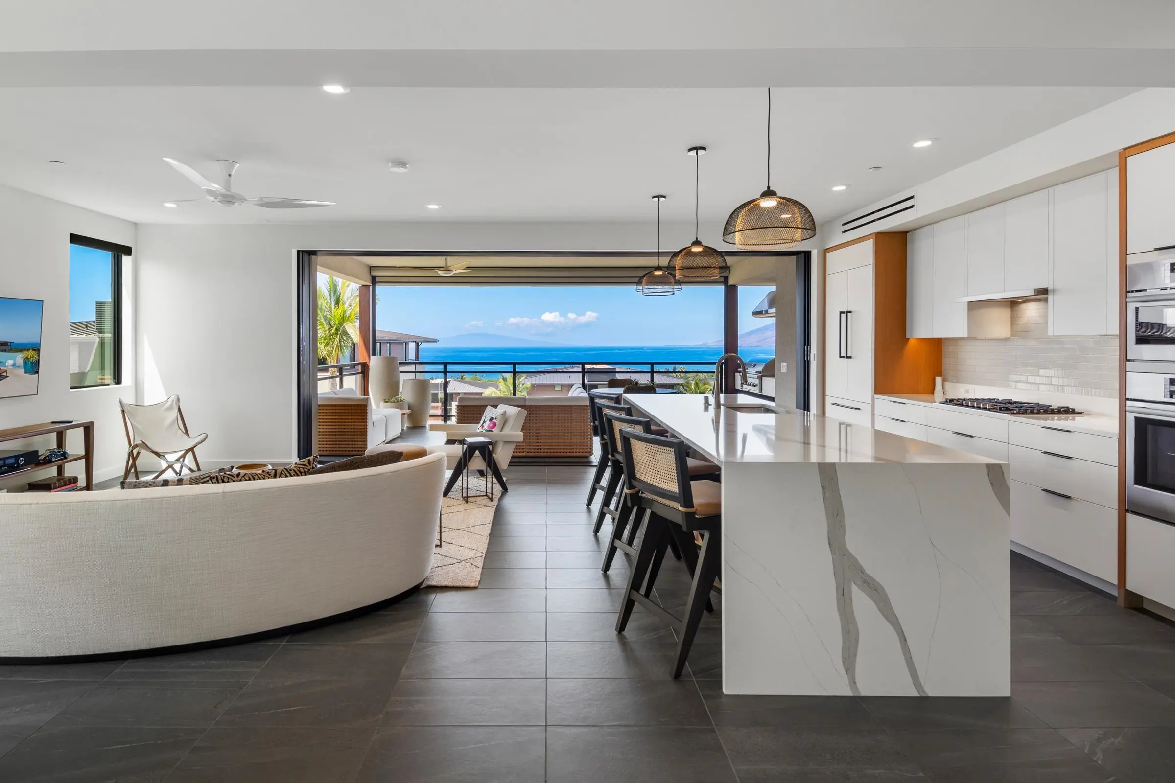 The one you’ve been waiting for at La’i Loa! Pride of ownership shines in this premier 3 bedroom, 3 bath villa, set in the most coveted location of the community. Villa 4C (aka 30-201) offers epic ocean and golf course views and allows you to enjoy one of the closest proximities to the exclusive recreational center. Blending elegance and comfort, the spacious open concept layout features upgraded tile flooring which flows gracefully to the two covered lanais. The main lanai is perfect for year-round outdoor living and entertaining where you can savor unforgettable sunsets paired with great meals prepared on the built-in Coyote gas grill. The chef-inspired kitchen is appointed with Bosch stainless appliances, Fisher & Paykel double dishwasher, U-Line wine cooler, custom cabinetry, and a dramatic quartz waterfall island with bar seating and pendant lighting. The primary suite is a relaxing private sanctuary with its own lanai and privacy shade screen. This villa has been very gently lived in and further enhanced with upgrades such as Lutron programmable lighting, custom electronic blinds, Hansgrohe fixtures, Toto toilets, and a Rinnai on-demand hot water system. Custom furnishings designed specifically for this villa are also negotiable. A secure garage with an EV charging capability, large storage room and an additional assigned parking stall provide everyday convenience. Owners at La’i Loa enjoy an infinity edge pool with a lap lane, an oversized hot tub, and a modern fitness center all just steps away from your villa. Nearby are all of Wailea’s many resort amenities including some of the best beaches on Maui, elite shopping opportunities, first class restaurants, golf and tennis. Special properties like this rarely become available.