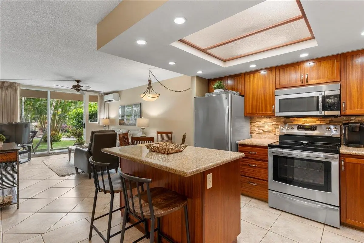 Don’t miss this beautifully renovated 1-bedroom, 2-bath ground-floor unit in the highly sought-after Maui Banyan! Ideally located across from Kamaole Beach II, this unit offers a perfect combination of comfort and convenience of island living. Tastefully updated with modern finishes, including a sleek kitchen, upgraded bathrooms, and stylish flooring throughout. The walk out lanai opens to a lush, tropical setting, allowing easy access to the pool and grounds. The kitchen features stainless steel appliances, updated cabinets and granite countertops. Unit has a split AC system, a new washer/dryer and comes fully furnished with inventory. The ground-floor location offers easy access with no stairs, making it ideal for owners and guests alike. Maui Banyan’s prime location in South Kihei is close to dining, shopping, and activities. Kamaole Beach II offers park areas, lifeguard stations and white sand beaches. Enjoy resort amenities that include two pools, hot tubs, BBQ areas, and tennis courts. Maintenance fee includes Wi-Fi and basic cable. Pet friendly complex for owners. Unit includes one deeded parking space. Maui Banyan is a versatile property that can be used as a vacation rental, second home or full time residence! Maui Banyan is a concrete building and H-2 HOTEL ZONED!