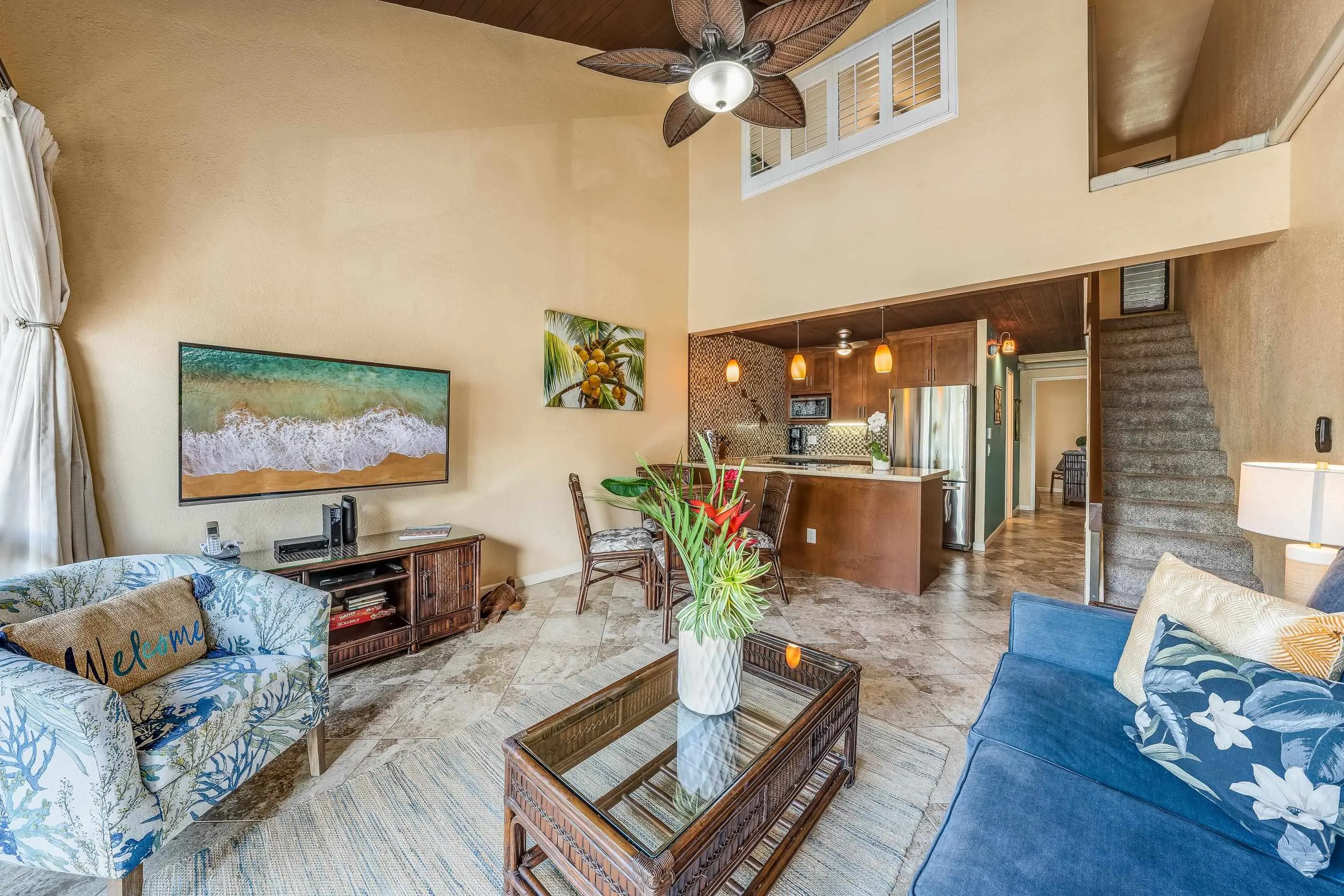 OPPORTUNITY KNOCKS! CURRENTLY, the second lowest priced 2-bedroom, fee simple, vacation rental condo for sale in South Maui (at time of listing!). EXPERIENCE SERENITY NOW...Tree top, West Maui Mountains and partial ocean views welcomes you here at this cozy beach condo located on the sunny shores of South Maui! Maui Vista is one of Kihei's popular sweet spots to experience the year-round beach and casual lifestyle you desire (and deserve)! This unit is perfect, too, as a primary home and/or second getaway home. This 2bd/2ba, 2-level, top-floor unit is uniquely positioned in Building 2, which is located one building back from the main road, yet close enough to be just minutes away from one of my favorite beaches on the island...Charley Young on the north end of Kamaole One Beach! This tastefully-furnished and turnkey condo is highlighted with the following features: vaulted and beamed ceilings in main living area; main bedroom is on second floor with ensuite bathroom, while second bedroom is on main level; diagonally laid tiled floors in main living area, kitchen, downstairs bathroom and lanai is ideal for easy maintenance; kitchen features granite counter tops, custom cabinets, stainless steel appliances, drop pendant lighting, and glass tiled backsplash complete this luxury look kitchen; full size stack washer and dryer upstairs; 3 split AC units (rarely found in most condo units) for cool and energy efficient year round living; ceiling fans in both bedrooms and living area; sleeper sofa is ideal for extra guests; and more! This complex offers many resort amenities including six tennis courts, common area BBQ and lounge areas, and three sparkling pools. Don't miss out on this rare opportunity to become the next owner of this fantastic vacation condo on Maui...paradise awaits you! Call your favorite realtor and make your appointment now, before it's gone!