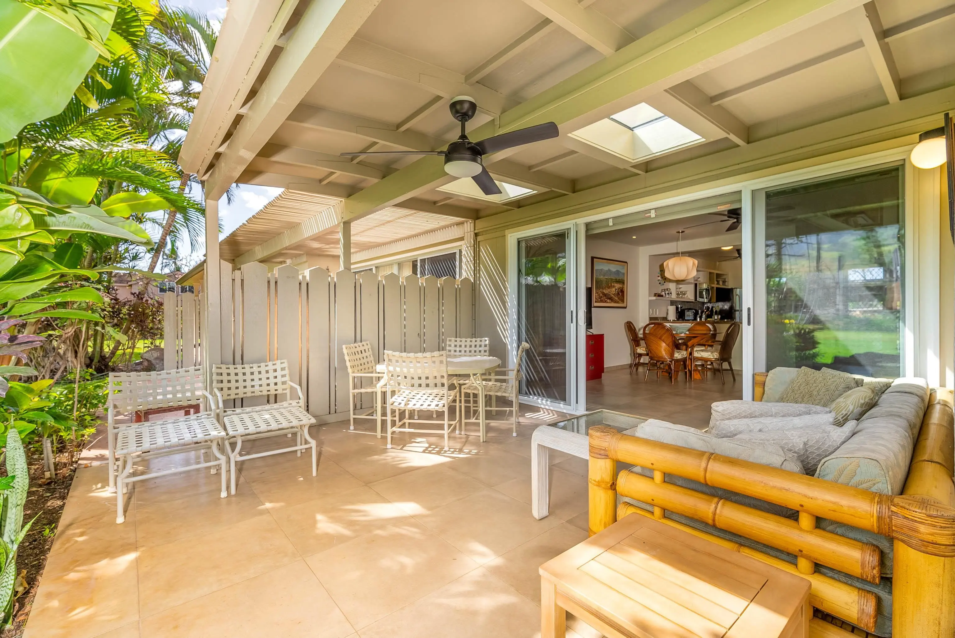 The lovely two-bedroom Puamana center garden is in a prime location near the ocean, beach access, and the dolphin pool. The living room opens to an extended lanai with skylights, creating a stunning outdoor living area overlooking one of Puamana's most prominent green belts. 87-2 is in the midst of the tropical oasis section of Puamana that survived the Lahaina fire. Title insurance and reasonably priced homeowners insurance are available for new owners.