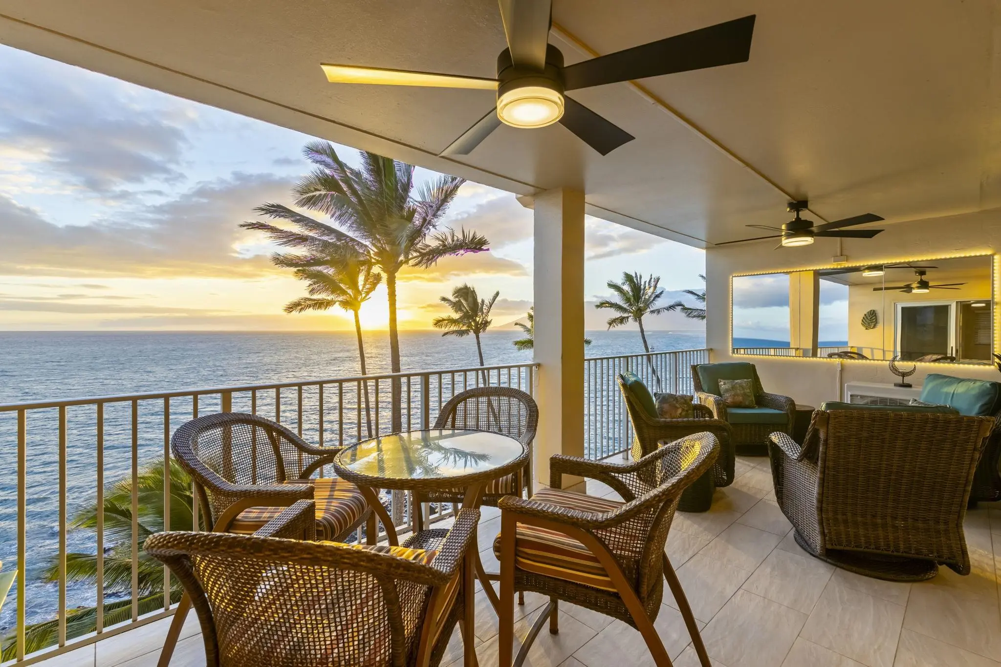 HOTEL ZONED! Unparalleled and rare opportunity to own a 3 bedroom, 2 bath luxurious condo, perfectly positioned directly on the Pacific Ocean with gorgeous Kamaole beaches on either side! Offered for sale for only the second time in decades and completely renovated to the concrete in 2020, Royal Mauian #618 is the ultimate corner penthouse. From the moment you enter this 1324 SF condo, the panoramic ocean and outer island views, trade breezes, and sound of the waves create your personal sanctuary. Revel in captivating views of whales, turtles, dolphins and year-round sunset vistas without leaving home. Versatile 16-foot multi-directional sliding doors w/foot friendly tracks seamlessly integrate the expansive additional 250 SF lanai into the living space. Custom African mahogany cabinetry throughout accented by Brazilian Tortuga granite counters and backsplash bring beauty into focus from every angle. SubZero refrigerator, stainless Bosch/GE appliances, and Delta touch faucets w/separate filtered water system complete the chef’s kitchen. Handcrafted Sans Soucie doors with etched privacy glass provide an artistic segue to the oceanfront and mountain bedroom suites. Striking African mahogany shoji doors allow privacy and versatility for the middle bedroom. Full-size Electrolux washer/dryer are conveniently located in a dedicated laundry closet. Smart lighting and 8 Modern Forms ceiling fans w/voice, wifi, or switch controls. Expansive storage including pantry closet with rollout freezer. Brand new (2024) Daikin tri-zone AC and 85 inch Samsung smart TV. Offered beautifully furnished w/few exceptions. Though you may not want to leave the condo, venture up to the recently renovated Rooftop Garden to enjoy breathtaking 360 degree views and a dining experience under the stars that you won’t find anywhere else. The Royal Mauian is HOTEL ZONED, so NOT one of the apartment zoned Minatoya list properties!