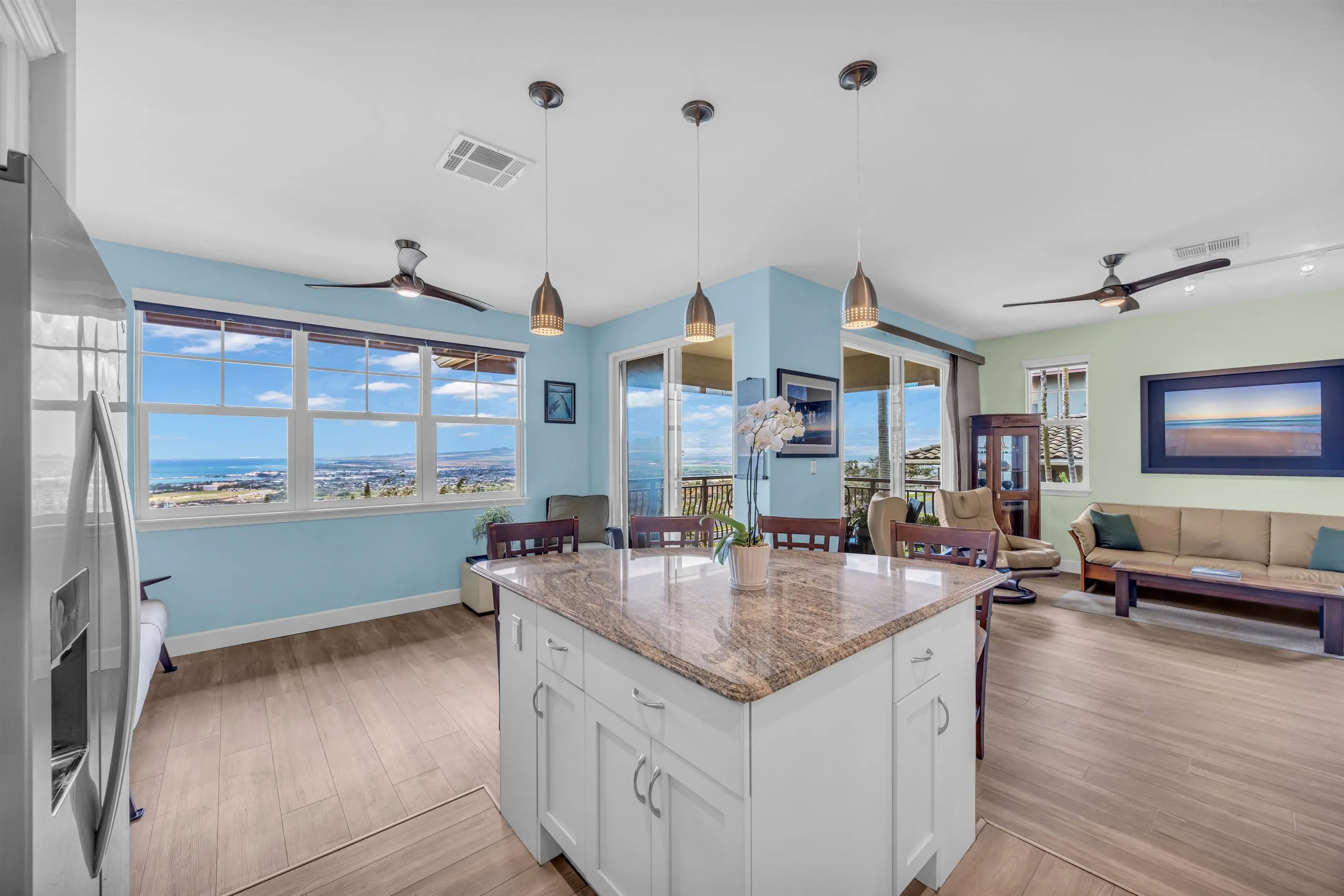 Discover a very rare offering on the front line in the gated community of Villas at Kehalani. It is all about the sweeping views combined with a first-class top to bottom remodel. All improvements were professionally designer installed with quality finishes throughout. The end unit location offers more privacy and extra light to this 2 bedroom 2.5 bath townhome. Kitchen improvements include: new refrigerator, stainless steel sink, Shaker style cabinet doors, and granite countertops. Downstairs flooring is high quality laminate. Upstairs is fully carpeted in the both bedroom suites. The primary bath features a spa like remodel with soaking tub and walk-in shower with custom tilework and lighting. Additional features include: walk in closet in the primary suite, full size washer and dryer, desk nook with built-ins, 2 car garage with epoxy finish floor. With a backdrop of the majestic West Maui Mountains and the panoramic ocean and stunning Haleakala views, be prepared to experience sunrises, rainbows, and the everchanging colors of the tropical skies. Enjoy nearby grocery, dining, shopping, schools, parks, and more. This offering is subject to Seller finding a replacement property.