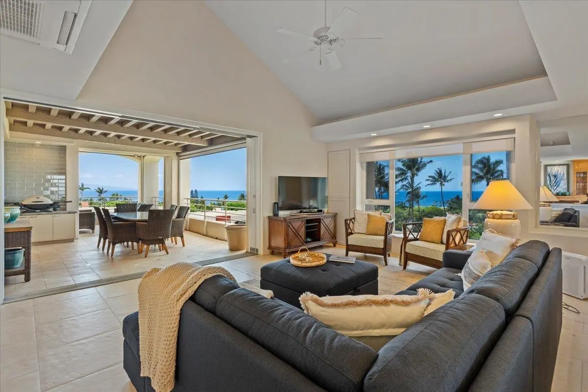 Nestled in the coveted Wailea Palms complex, Unit 3106 epitomizes modern, resort-style living in the heart of one of Maui’s most renowned communities. This elegant and contemporary residence offers breathtaking panoramic ocean views from almost every room and features seamless indoor-outdoor living with arguably the best floor plan in the complex. The open and inviting main living space is distinguished by high-vaulted ceilings and floor-to-ceiling windows that flood the rooms with natural light. Outside, the expansive oversized lanai captivates with its vibrant ocean views and beautifully manicured tropical landscapes—an ideal spot to indulge in the stunning scenery. The luxury continues in the gourmet chef’s kitchen, equipped with Sub-Zero appliances, granite countertops, and bar seating. Large windows provide ocean views, the perfect backdrop while preparing any meal. The main living area is complemented by a generously appointed dining room with access to the lanai. The master suite exudes opulence, featuring private lanai access and an en-suite bathroom with dual vanity and walk-in shower. An additional bedroom, ideal for a private office or guest room, and an additional bathroom complete the unit. Wailea Palms, known for its resort-like ambiance, offers premium amenities including a workout room, professional-quality putting green, and a newly renovated barbecue pavilion. Moreover, this unit boasts unparalleled proximity to Wailea and Makena’s best beaches, restaurants, and activities. Don’t miss this exceptional opportunity to experience the pinnacle of Wailea living.