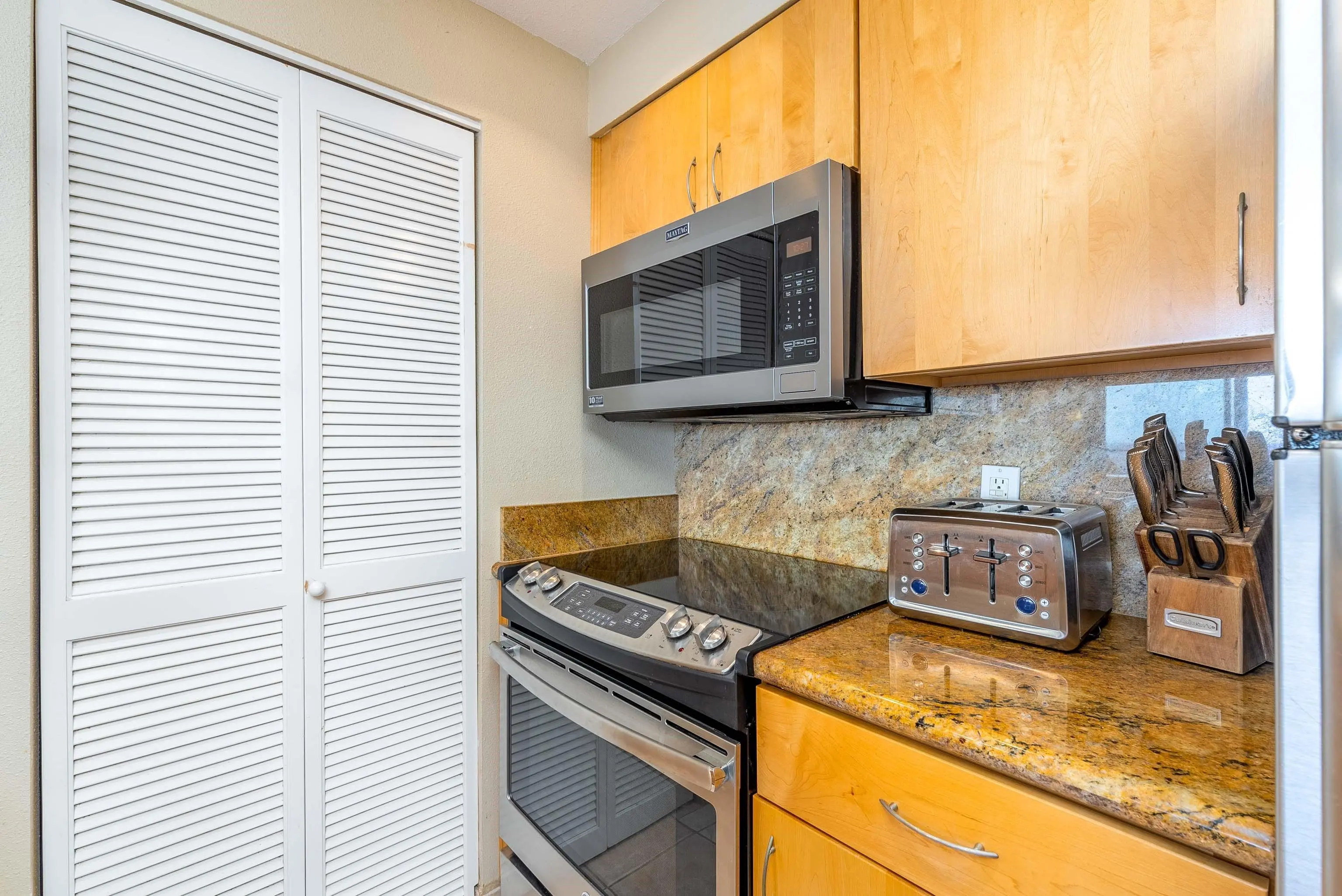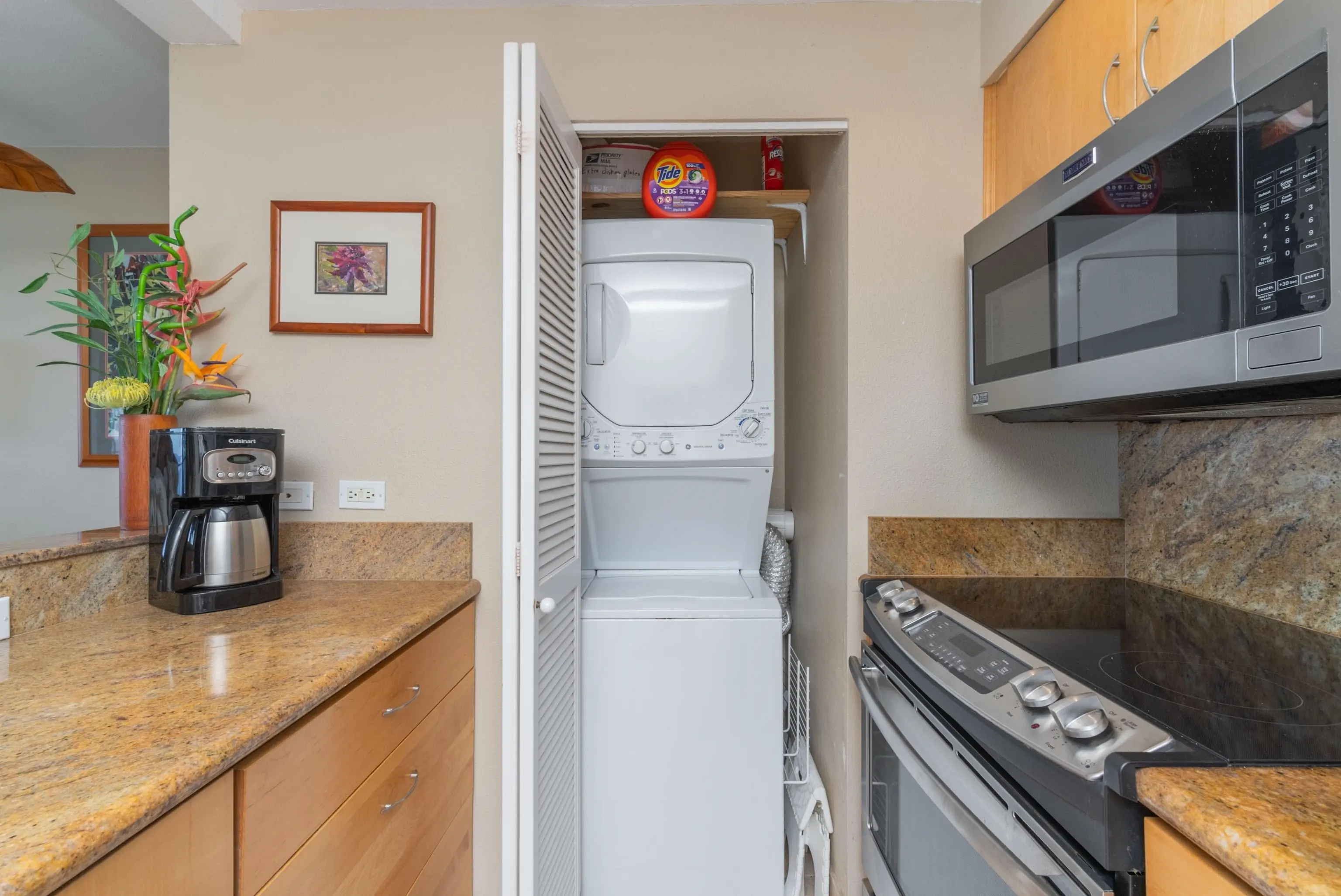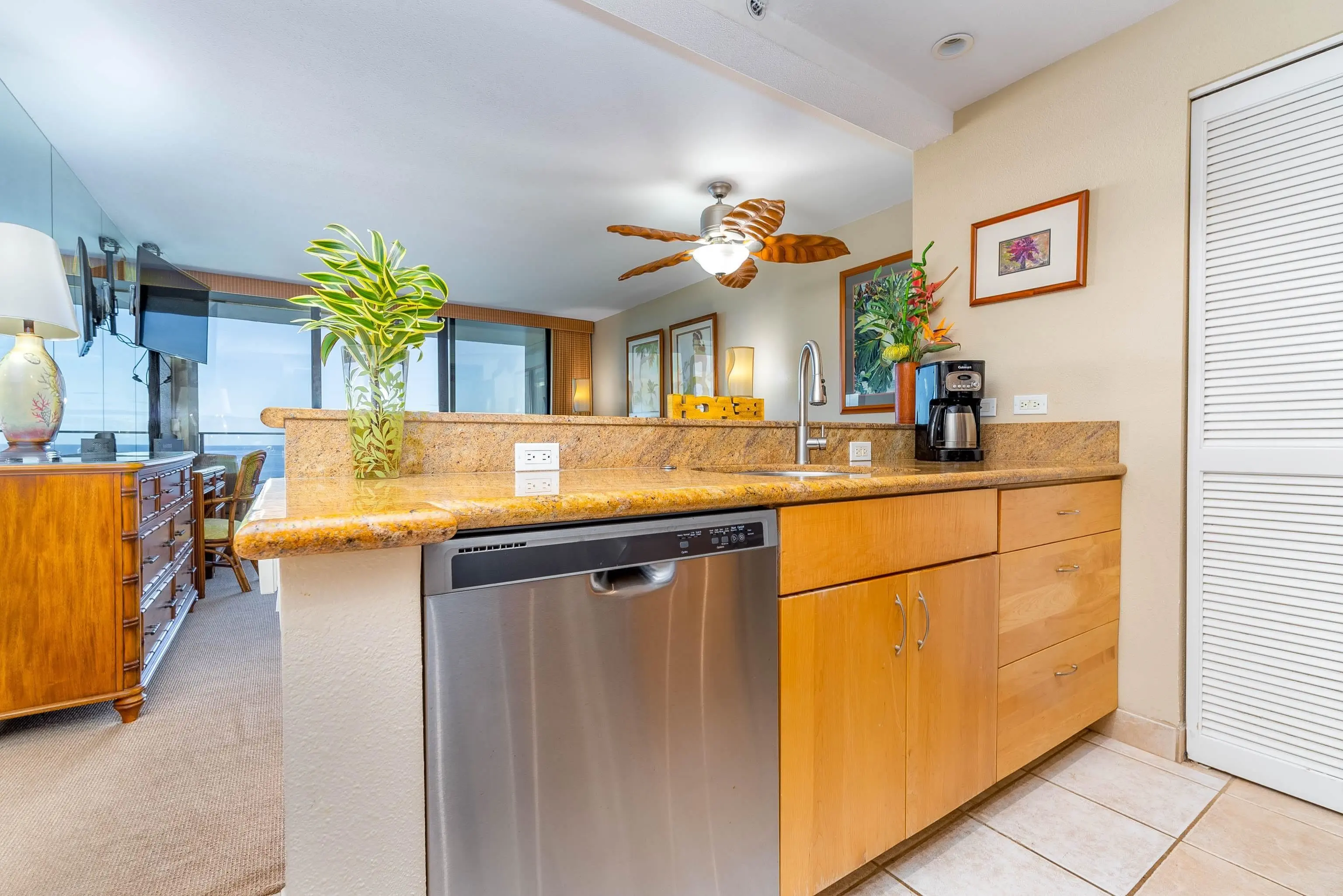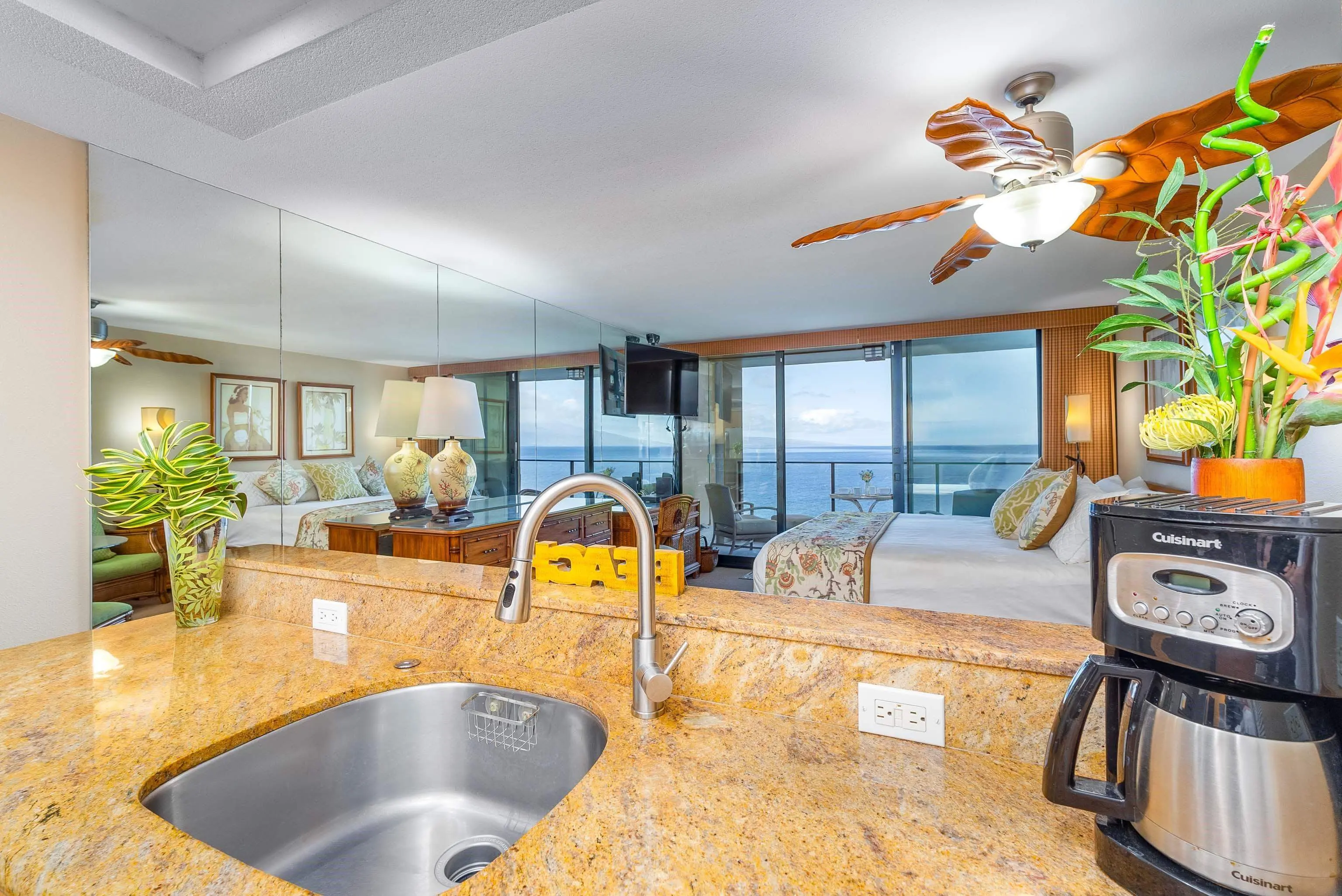 Condos in this location occur in three sizes: efficiency studios of 540 square feet, one-bedroom, one-bath units of 938 square feet, and two-bedroom, two-bath units of 1,418 square feet. Every oceanfront condo includes a private lanai, as well as an open floor plan offering excellent views. Residents enjoy a modern kitchen, with a variety of built-in appliances (including a refrigerator, a dishwasher, a range/oven, and a microwave).